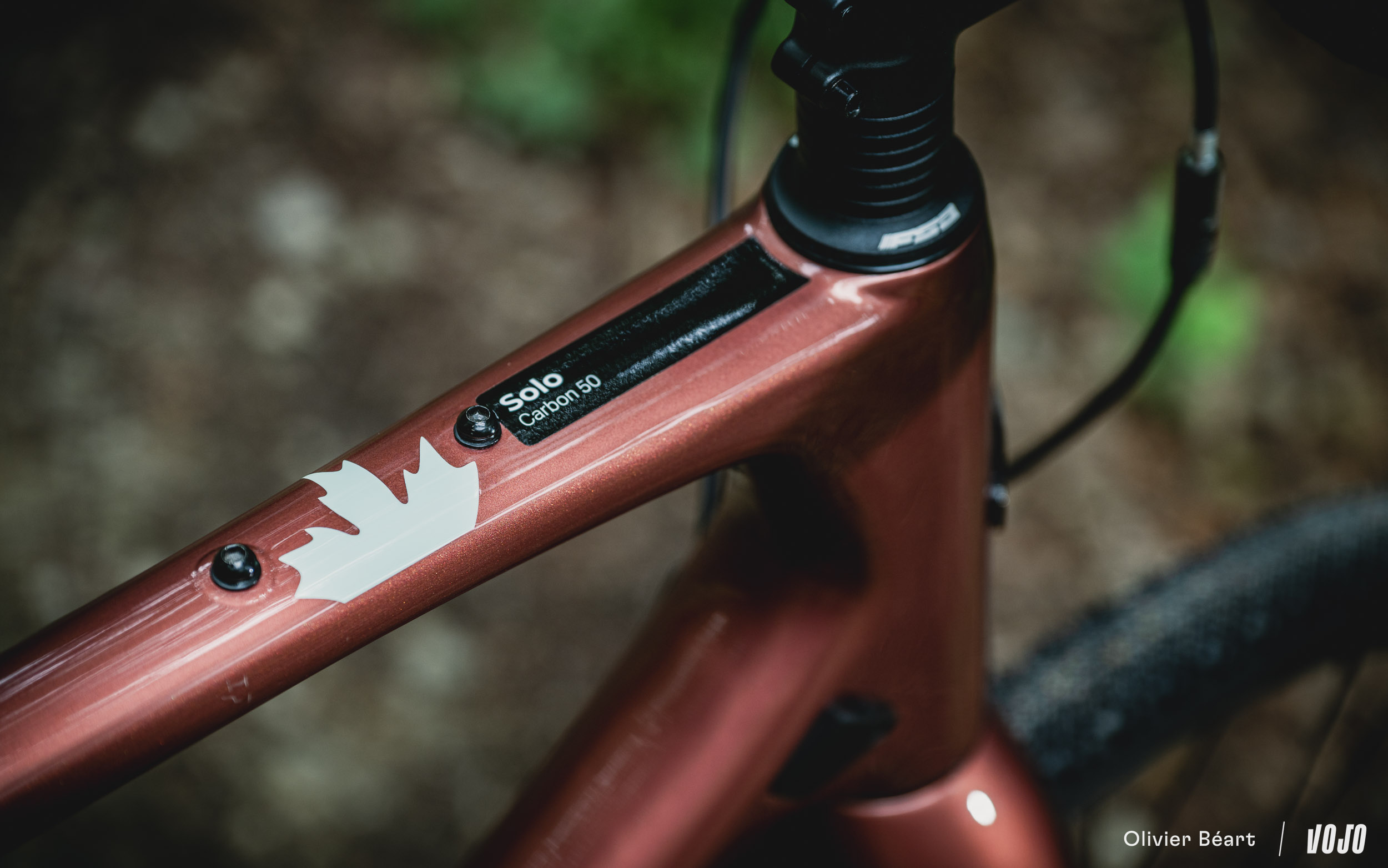 Autrefois proposé uniquement en aluminium, le nouveau Solo est cette fois décliné également dans une version carbone nettement plus travaillée. On constate qu’un gros boulot a été fait sur le tube de selle, avec une partie fortement aplatie au niveau de la jonction avec le boîtier de pédalier. A noter que, malgré cette forme et même si tous les montages sont en mono-plateau, Rocky Mountain permet toujours le montage d’un dérailleur avant et l’utilisation en double plateau. La tige de selle est passée en diamètre 27,2mm sur cette dernière génération, toujours dans l’idée d’offrir plus de confort.