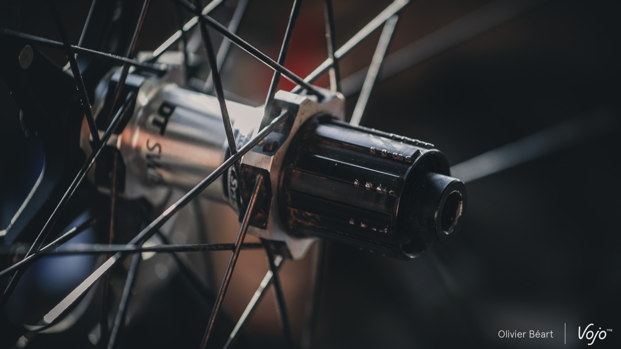 Tant qu’on est dans les considérations techniques liées au moyeu arrière, parlons quelques instants du mécanisme de roue-libre. Si n’importe quel « body » type Shimano en aluminium se marque, le DT Swiss a tendance à se marquer plus fort que d’autres, de sorte qu’il est souvent difficile de retirer la cassette en cas de changement. Il faut alors jouer du tournevis, ce qui n’est pas bien compliqué, mais on s’en serait bien passé et, vu la qualité de l’ensemble, on se dit que DT pourrait utiliser un aluminium un peu moins tendre. Cela dit, ça n’altère pas le fonctionnement global et nous avons à l’atelier des corps de roue-libre DT bien marqués qui ont plus de 10 ans sans jamais avoir causé de souci.