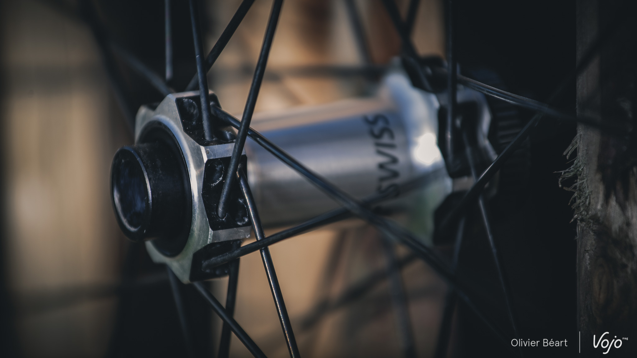 Les moyeux des DT Swiss X 1700 bénéficient d’une finition spécifique absolument somptueuse, avec un corps en aluminium poli juste relevé de quelques touches de noir. Assurément, ce choix est pour beaucoup dans la très belle qualité perçue du produit. A tel point que ces roues ne font pas du tout tache sur un vélo haut de gamme… ce que certaines marques ont bien compris en les référençant sur des machines à plus de 5000€. Profitons-en pour faire une petite mise au point : oui, ce sont de belles et bonnes roues (comme nous le verrons plus loin), mais ne vous laissez pas « berner ». Selon nous, sur des vélos qui naviguent dans ces eaux tarifaires là, c’est au minium des XR 1501 que vous devez retrouver.
