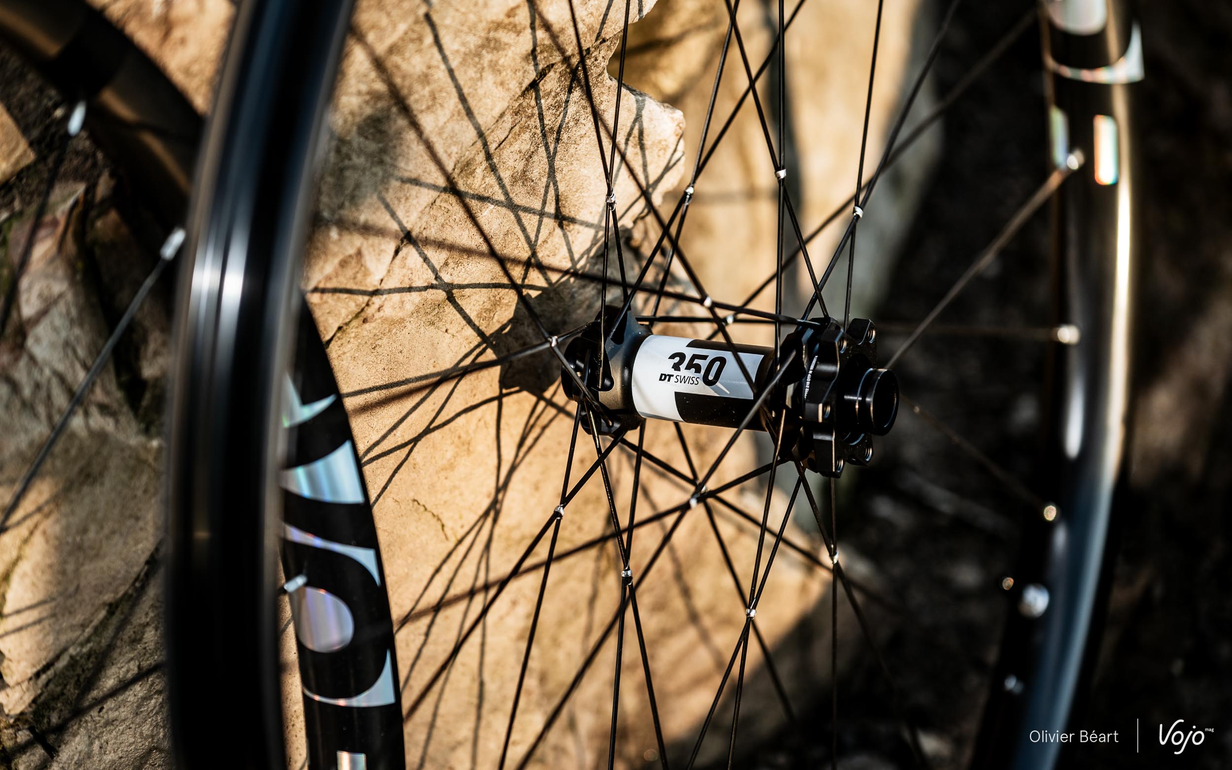 Quatre niveaux de gammes pour autant de moyeux sont prévus par la marque française, pour un tarif compris entre 980€ et 1599€. Sur notre paire de test, ce sont des moyeux DT Swiss 350 que l’on retrouve. S’il s’agit là de moyeux offrant un très bon rapport qualité/prix, une option plus onéreuse permettrait de gagner quelques grammes, mais c’est moins important au centre de la roue qu’à l’extérieur, au niveau de la jante. Reste à chacun d’estimer le budget qui lui semble approprié pour son usage et son portefeuille. Pour le reste, ce sont 28 rayons plats croisés par trois qui composent ces EvoCross. Comme dans la majorité des montages artisanaux, l’option ligature est possible moyennant un supplément, en l’occurrence 20€ par roue. Qui dit montage artisanal dit également personnalisation possible pour la déco : il est ainsi possible de choisir la couleur du lettrage, mais également des écrous parmi une multitude de couleurs.