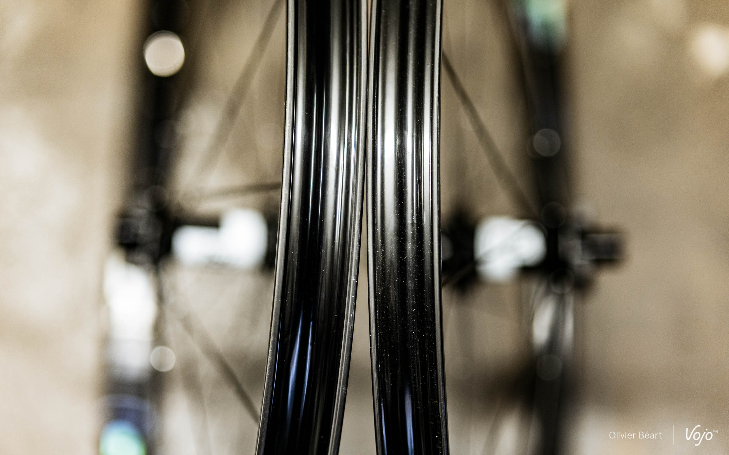 Si les moyeux et les rayons proviennent des catalogues de grandes marques (DT principalement), il faut savoir que Rémi Groslambert est ingénieur composites de formation. Il a donc développé ses propres jantes carbone en collaboration avec un fabricant asiatique réputé. Cette paire de roues carbone se caractérise par une largeur différenciée des jantes à l’avant et à l’arrière. On retrouve ainsi une largeur interne de 30 mm à l’avant tandis que la jante arrière est de 26 mm et à base de fibres plus résistantes aux impacts.
