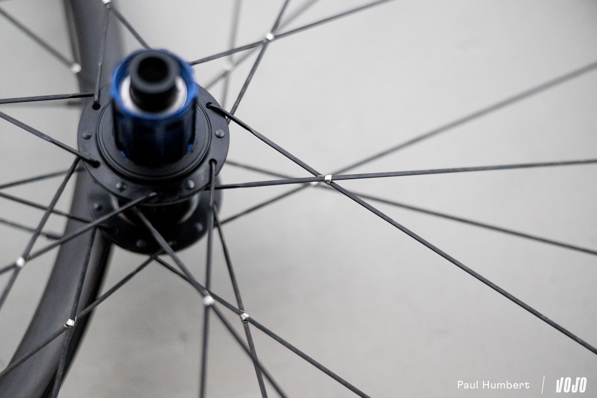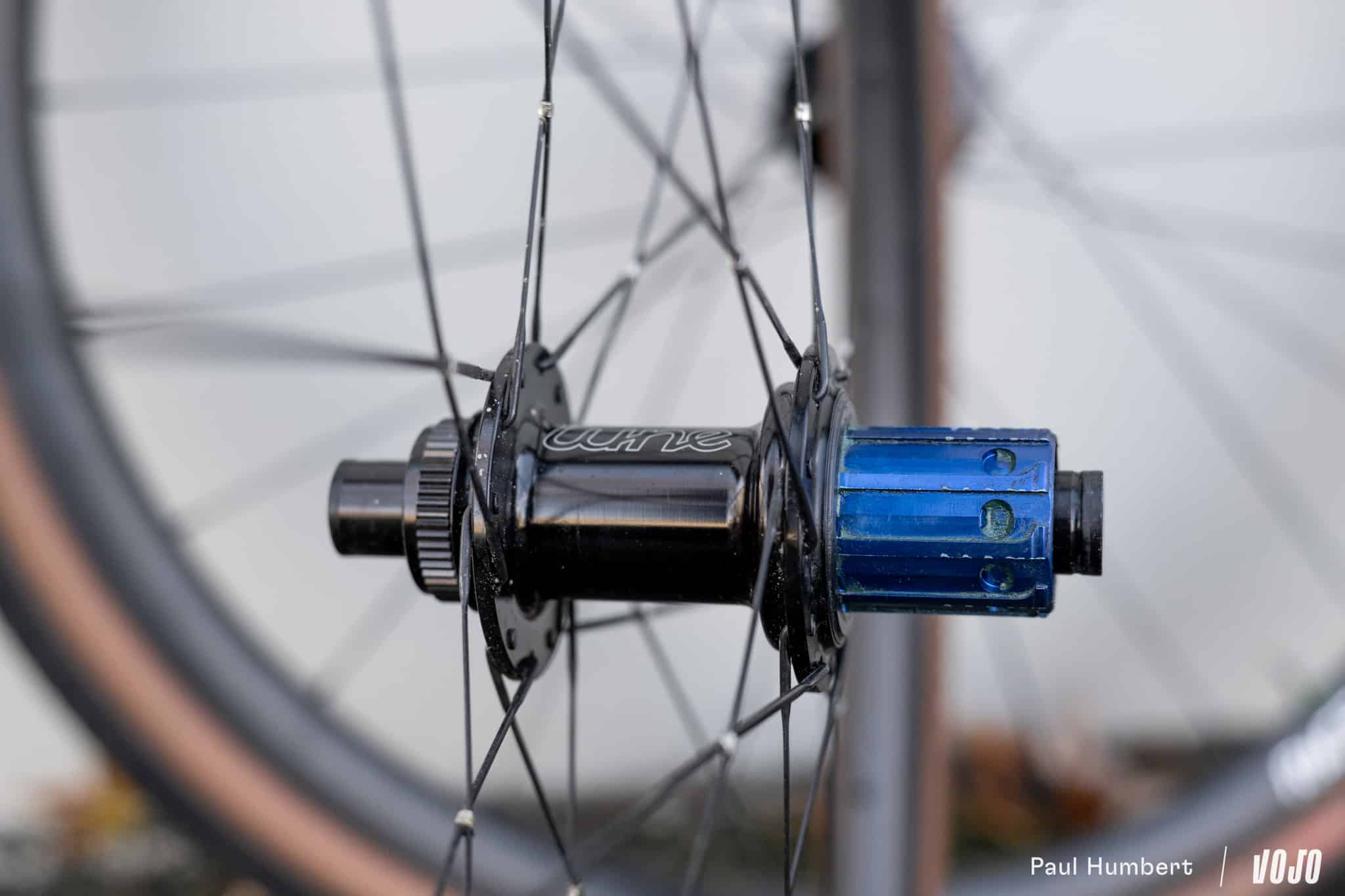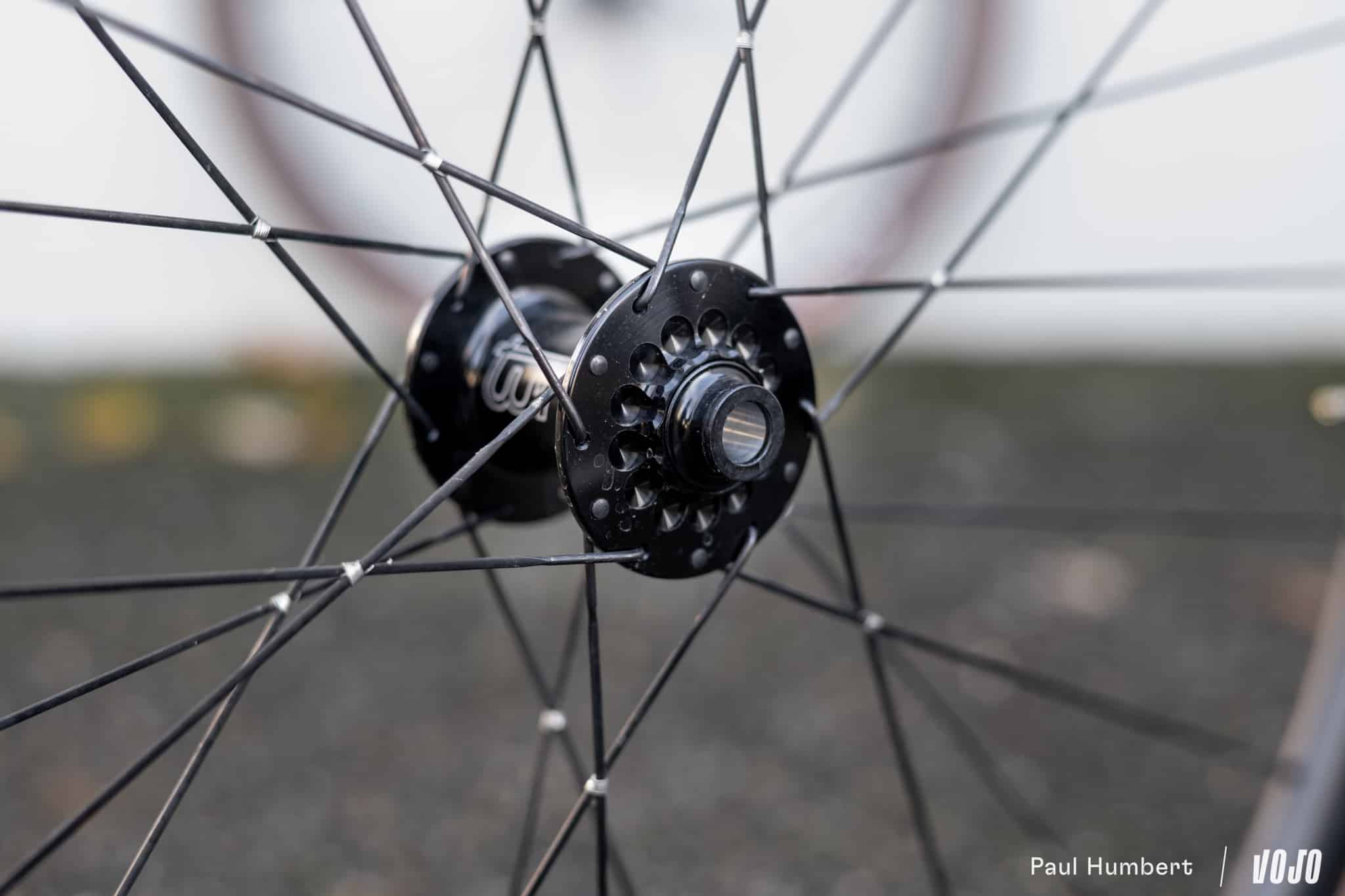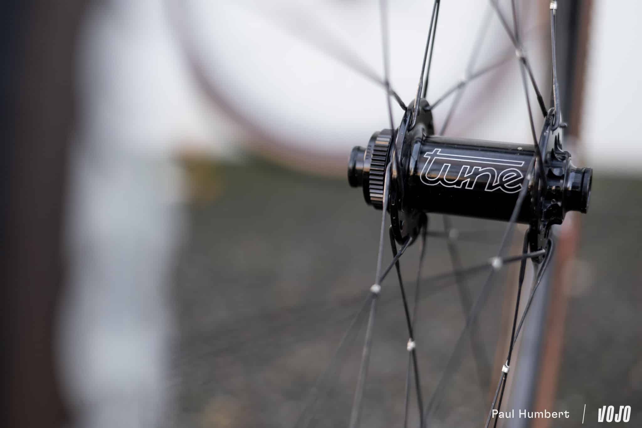Les moyeux sont des Tune KillHill/ClimbHill avec les corps de roue libre « légers », reconnaissables à leur couleur bleue (par opposition aux modèles dorés à cliquets renforcés) et des roulements changés par Asterion, qui n’est pas satisfait de ceux montés d’origine par Tune. Pour les rayons, on retrouve la référence Sapim CX-Ray, au nombre de 24 à l’avant comme à l’arrière, croisés par deux et ligaturés.