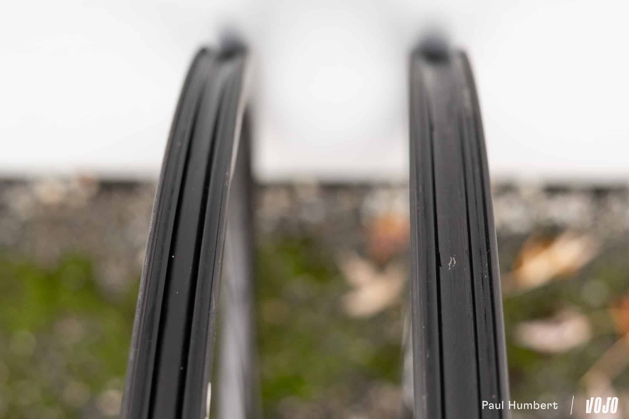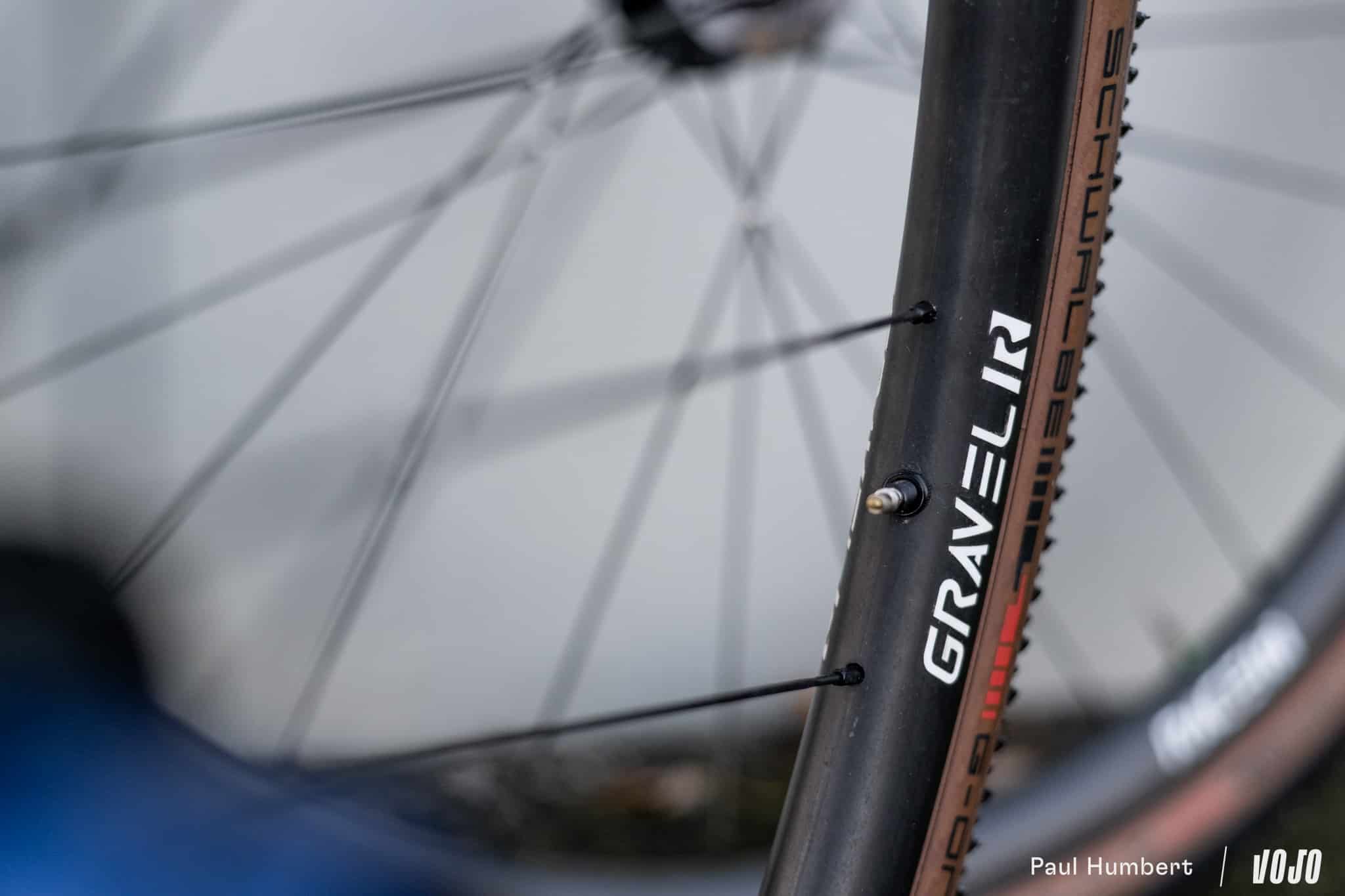 Sur le volume des pneus en tout cas, rien ne change. Nous avons testé ces roues avec des Schwalbe G-One R (dont le test arrivera plus tard dans l’année) en 40 mm, section sportive mais polyvalente, et nous avons mesuré entre 39,8 mm et 40,0 mm sur les quatre roues.
