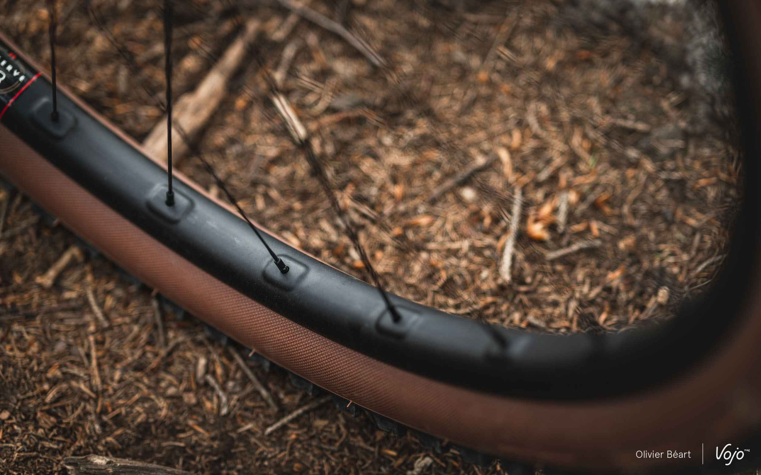 Lors d’un examen attentif de la jante, on peut repérer de petits renforts au niveau de la zone des rayons. Reserve explique que l’utilisation de trous de rayons fortifiés à l’extérieur permet de « renforcer la zone où la jante subit le plus de force, autour de l’écrou du rayon. Cela permet d’améliorer la résistance sans ajouter de poids inutile puisque nous ajoutons des couches de carbone là où c’est uniquement nécessaire, là où les impacts sont les plus forts ».