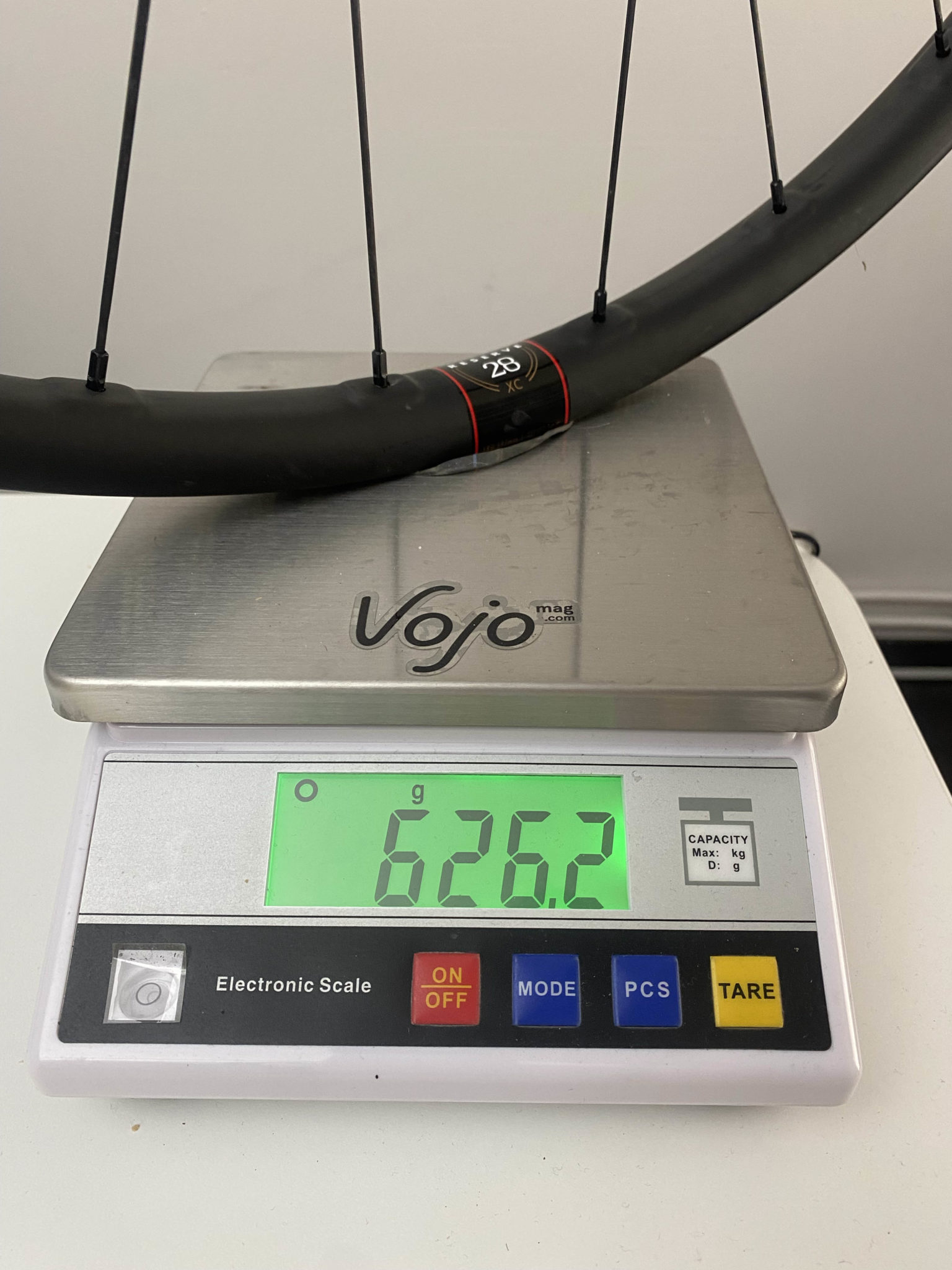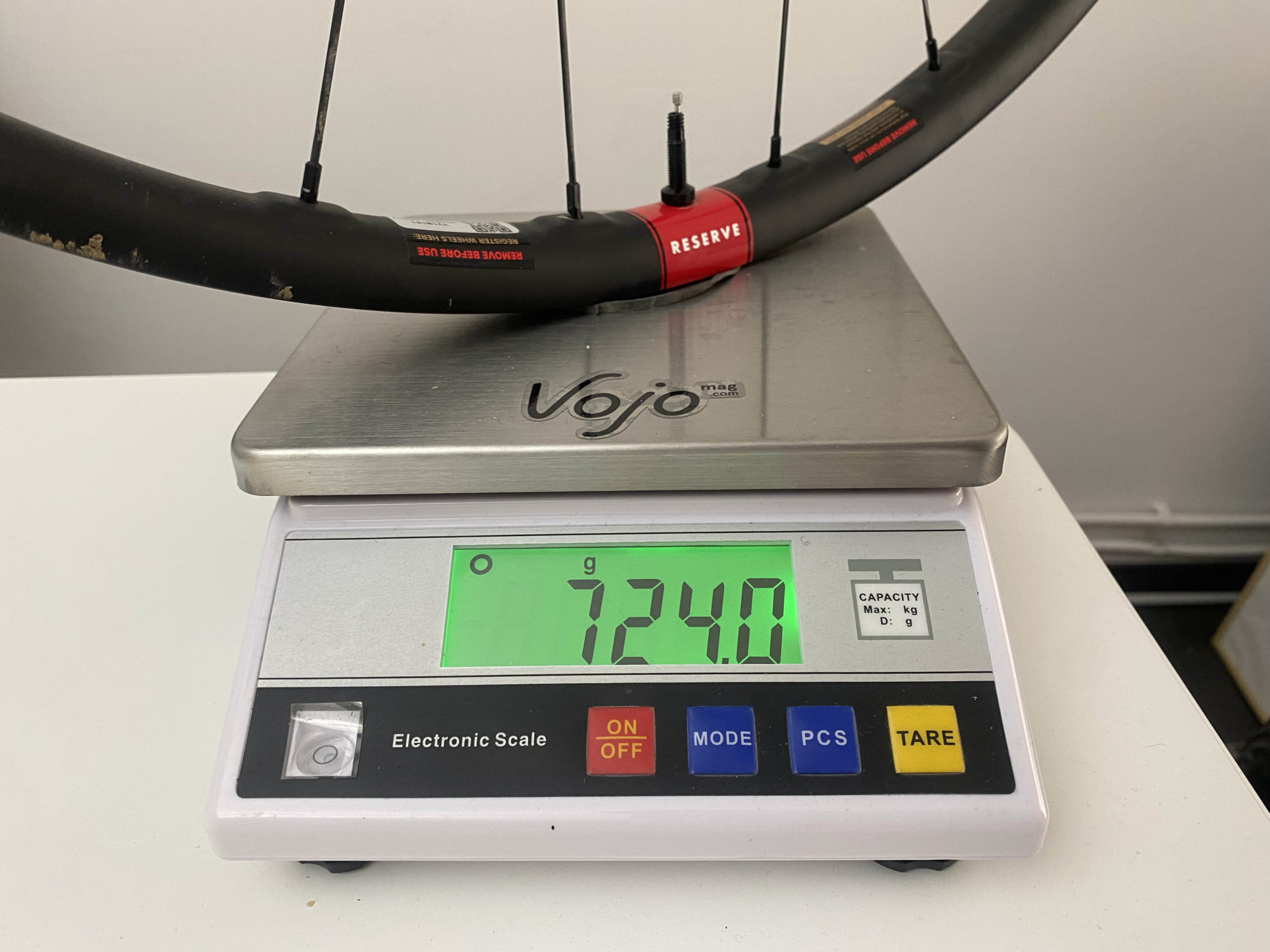 Les Reserve 28 XC, avec moyeu DT Swiss 180, pèsent 626g pour l’avant et 724g pour l’arrière, soit 1350g la paire avec valves sur notre balance (contre 1387 g annoncés), ce qui ne les positionne clairement pas en tête dans la course pour les roues les plus légères, mais qui les place tout de même dans la bonne moyenne.