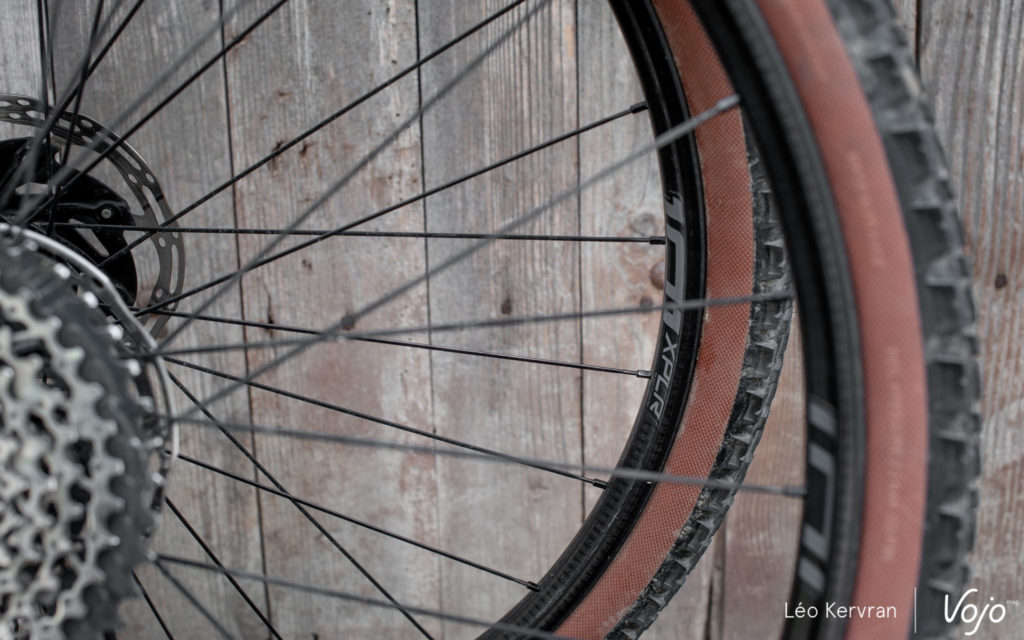 Ce résultat, c’est donc une jante simple paroi très épaisse (30 mm de largeur interne pour 37,5 mm en externe sur le modèle VTT) qui est pensée pour offrir à la fois de la rigidité latérale pour le maintien et rigidité en torsion pour l’efficacité, mais de la souplesse frontale pour le confort grâce à ce fameux « effet cheville ».