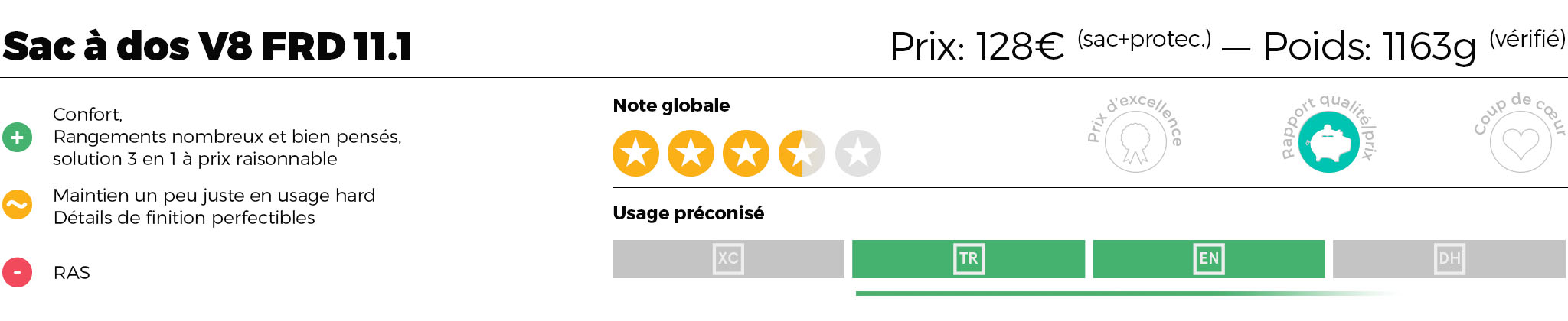 Moins cher que la plupart de ses concurrents, le sac V8 FRD 11.1 se démarque par plusieurs points astucieux et bien pensés. On sent que ce sac a été conçu par des personnes qui roulent et qui savent de quoi elles parlent. Le concept 3 en 1 (sac et dorsale utilisables séparément ou ensemble) est aussi très intéressant. Quelques détails de finition mériteraient d’être plus soignés et quelques points pourraient encore être améliorés (nous ne doutons d’ailleurs pas qu’ils le seront vu les feedbacks demandés par la marque en cours de test et l’intérêt que nous avons perçu par rapport aux suggestions que nous avons pu faire) mais en l’état et vu le tarif auquel il est affiché, vous ne serez pas volé si vous décidez d’investir dans ce V8 FRD 11.1.