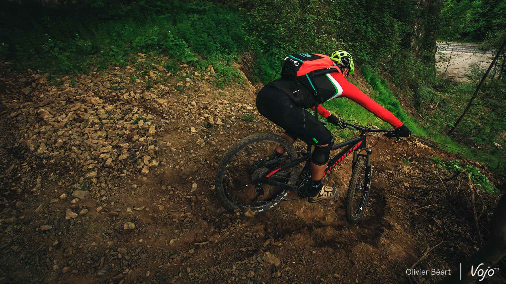 Le système de fixation centrale des bretelles joue bien son rôle, se montre très facile à manipuler et assure un bon maintien, du moins tant que le sac n’est pas trop chargé et qu’on ne s’aventure par vers des usages très musclés. En mode rando technique avec 1,5 litre d’eau dans la poche et juste un kit de réparation, il fait corps avec le pilote et son confort est parfait, même si on n’atteint pas l’excellente du sac Uswe (plus petit, c’est vrai). Mais quand on joue à charger le V8 FRD au maximum avec 3 litres d’eau dans la poche et qu’on s’aventure sur des pistes de DH, il vient régulièrement taper sur le casque et la nuque lors des phases d’impact.