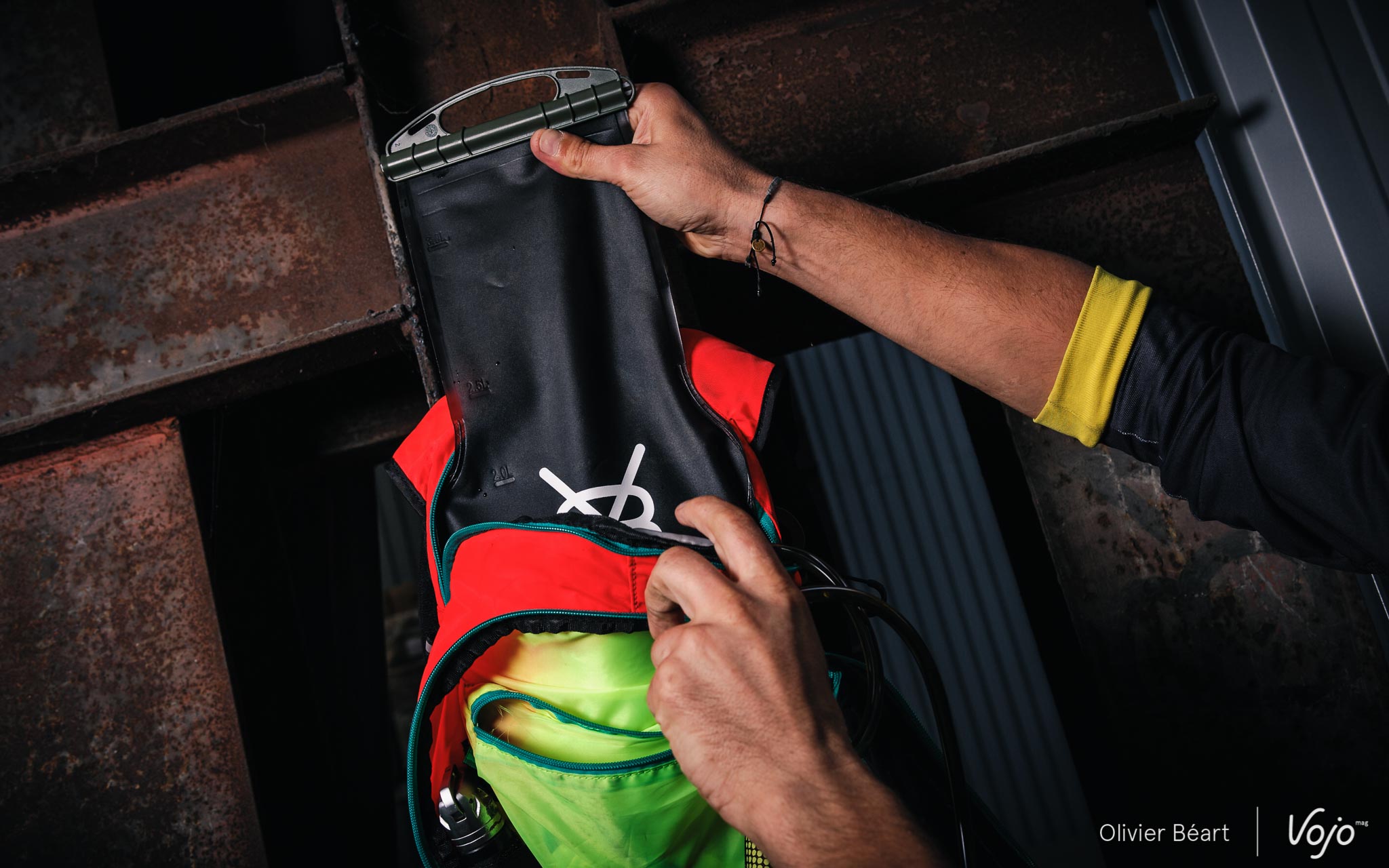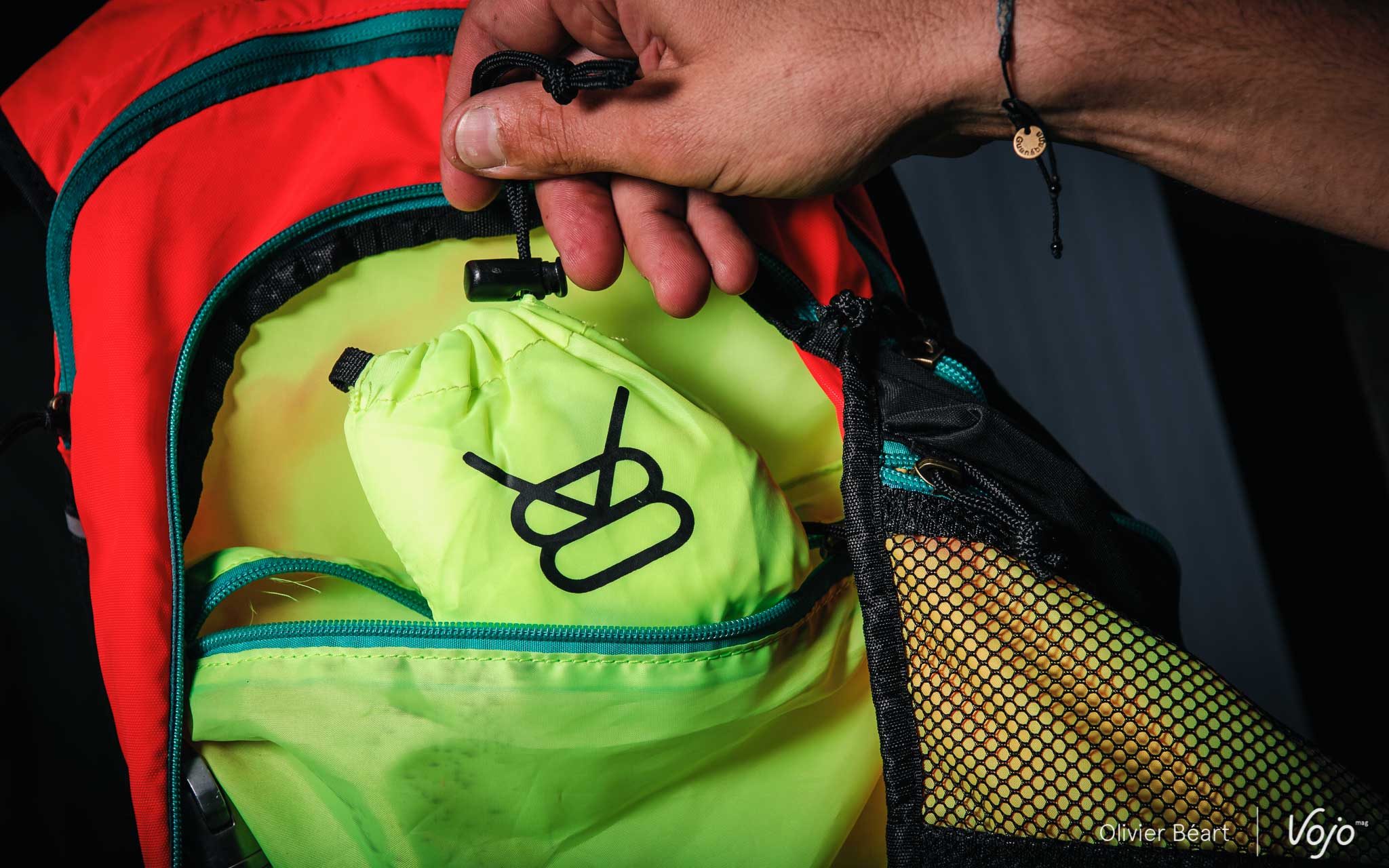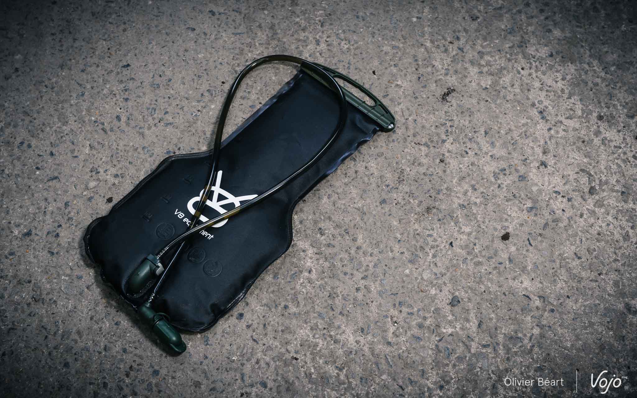 Le V8 FRD 11.1 se veut compact et ne compte que deux poches. Dans la plus grande, on place la poche à eau qui, si elle est bien remplie avec 3l de boisson, prend presque toute la place. Il reste juste de quoi glisser une veste ou une pompe à suspension voire un mini casse-croute mais pas plus. Si vous avez besoin d’un volume plus important, il existe une version plus grande, le V8 FRD 20.1 (89€).