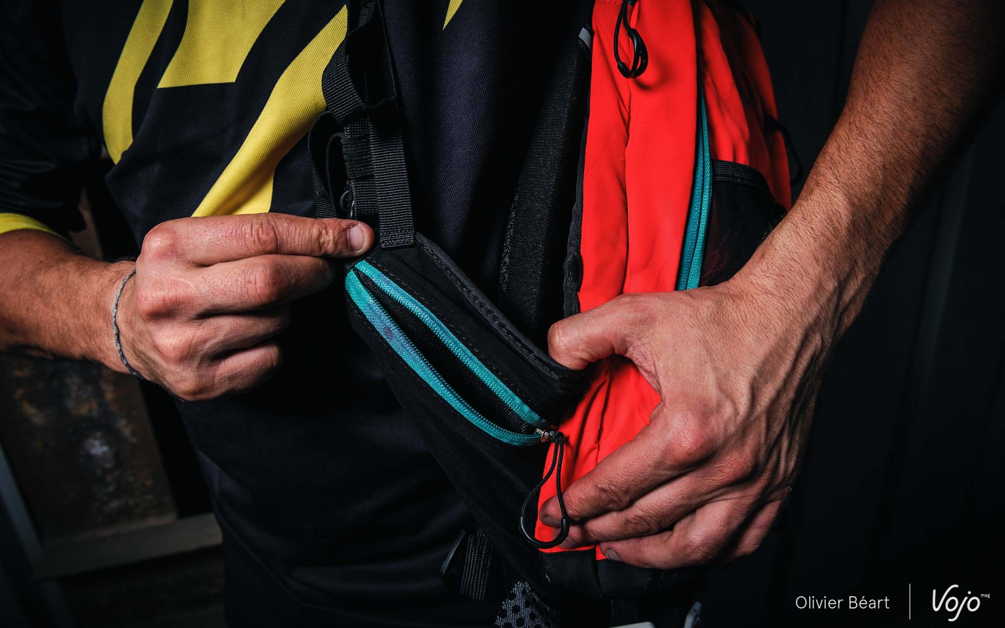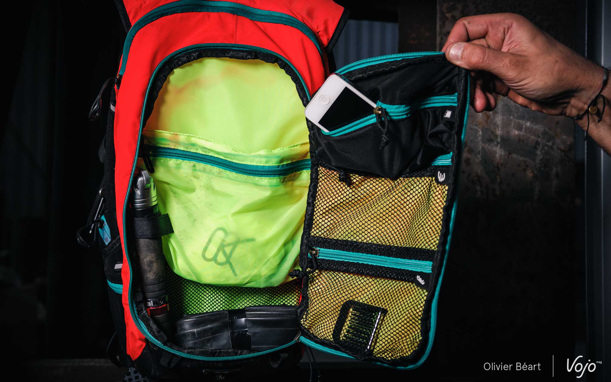 Si la poche dorsale est vite remplie par le réservoir d’eau, la deuxième poche joue dans le registre « petit mais costaud ». Sans paraître gigantesque, son organisation et les nombreux petits rangements qu’elle compte sont bien organisés et permettent de subdiviser utilement l’espace.
