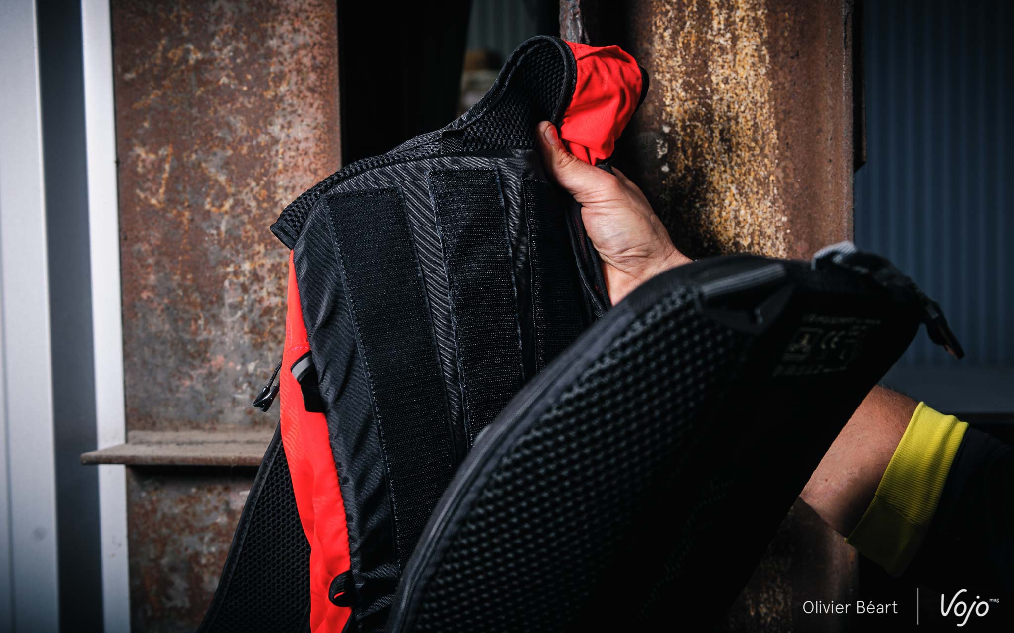 Le sac arrive en plusieurs parties, dans la mesure où on peut choisir de rouler, ou non, avec la protection dorsale. Pour passer de l’un à l’autre, il suffit de tirer sur la partie arrière du sac, un simple dos en mousse qui tient grâce à des Velcros, et de placer la protection dorsale sur ces mêmes bandes accrocheuses. La dorsale rajoute une petite épaisseur par rapport au dos classique, de sorte qu’il faut re-régler les bretelles, mais cela se fait facilement et le sac, même s’il est plus rigide, reste agréable à porter.