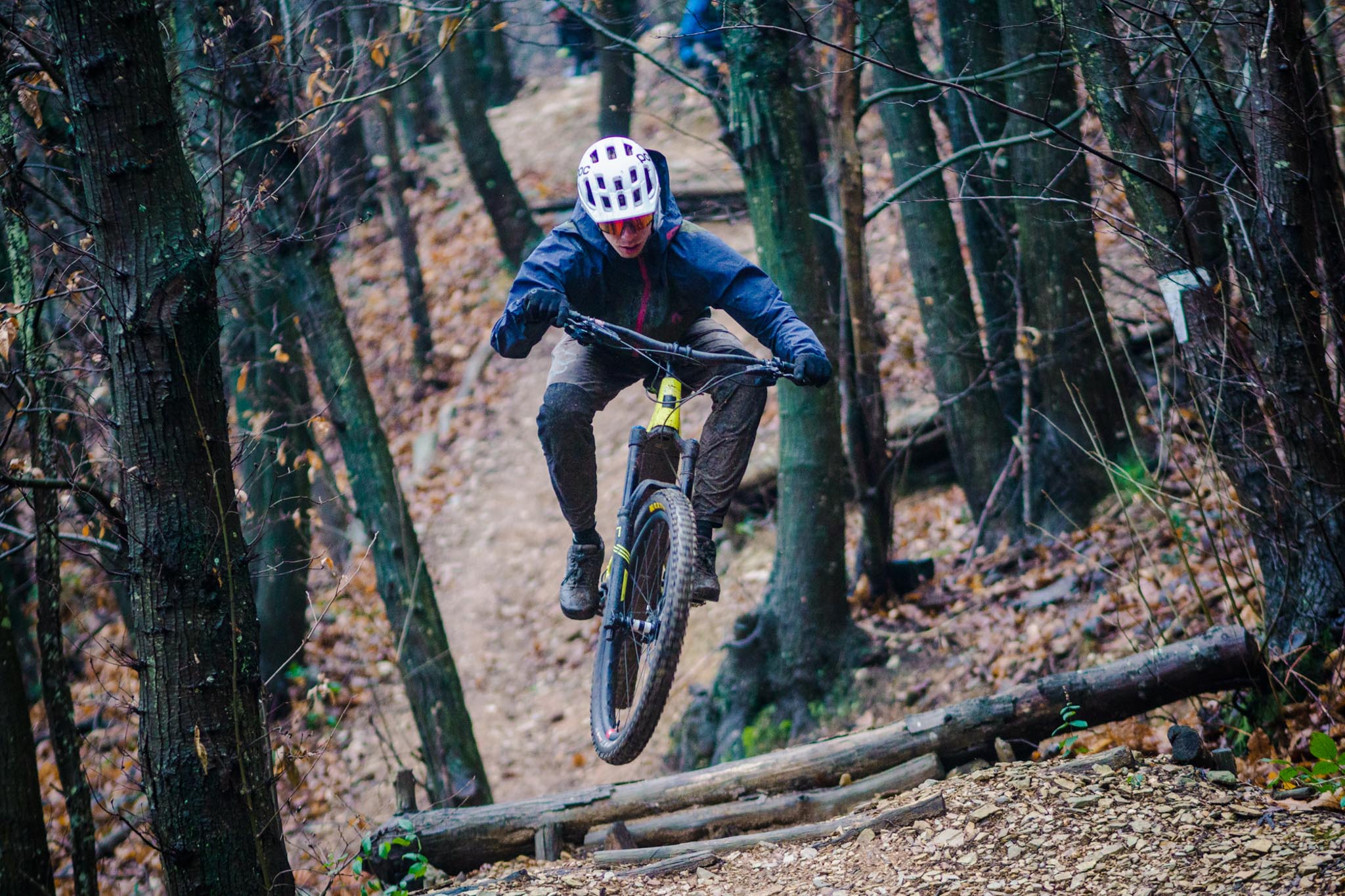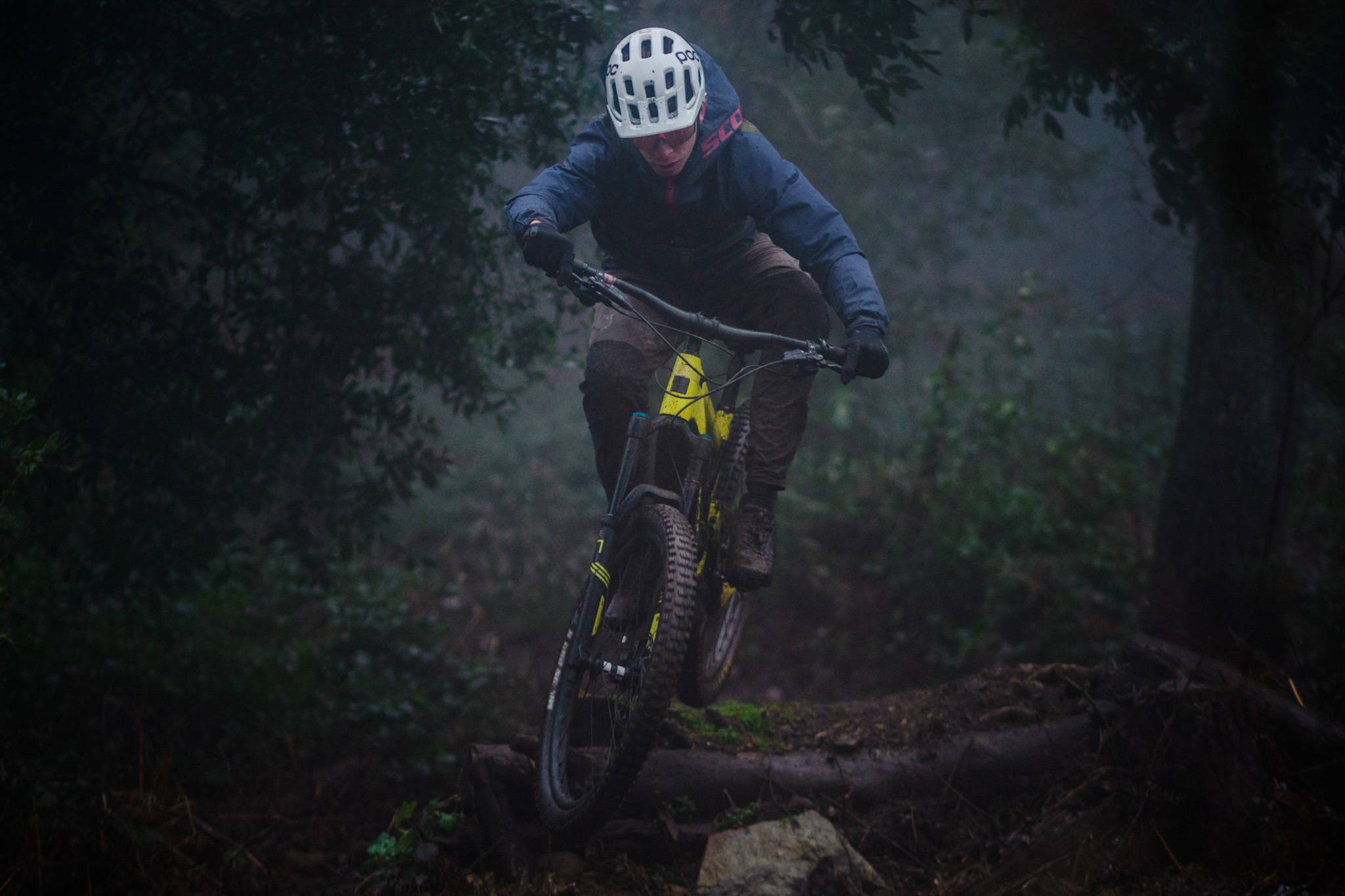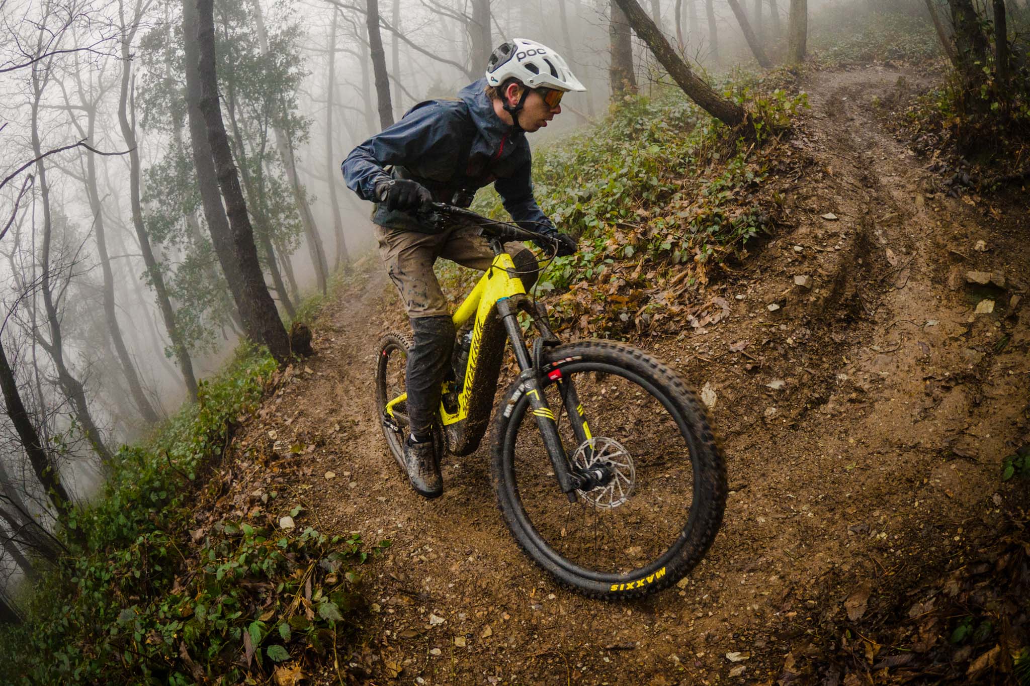 Dans les portions plus travaillées, on pousse sur le vélo qui reste bien en ligne et on le bouge facilement tant qu’il ne faut pas décoller les roues du sol. Le réglage de compression « light » de l’amortisseur nous permet de garder un super contact au sol, même quand on avance sur des oeufs sur ce terrain détrempé. On met de l’angle facilement et le vélo bouge bien entre nos jambes.