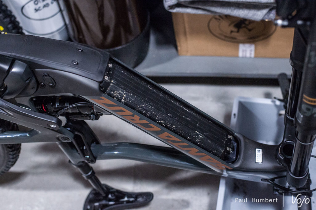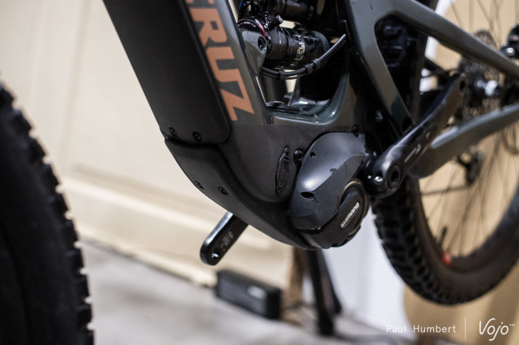 Toutefois, Santa Cruz a fait le choix, qu’on salue, de rester fidèle à Shimano sur toute la sélection des composants : shifters, capteurs et batterie. Cela permettra une prise en charge bien plus aisée en cas de SAV partout dans le monde. Le choix de la marque s’est également fait pour son côté « plug and play ». Toujours pour Todd Ford, « on a tout testé sur le marché, et on a choisi Shimano avec qui on a pas mal de libertés, notamment dans le choix des composants ». Enfin, pour répondre aux premières interrogations sur la pertinence du choix de moteur, on nous répond assez sereinement que « la différence est dans le châssis ».