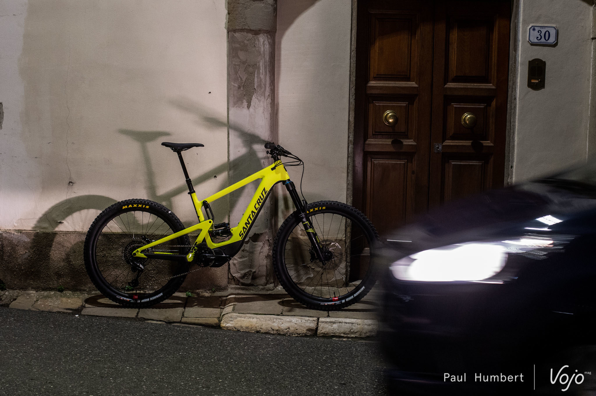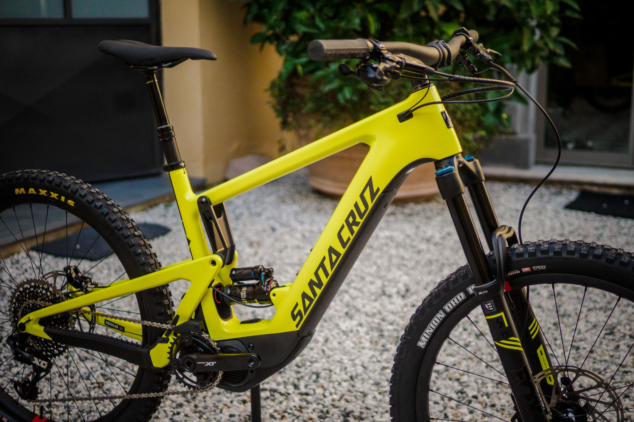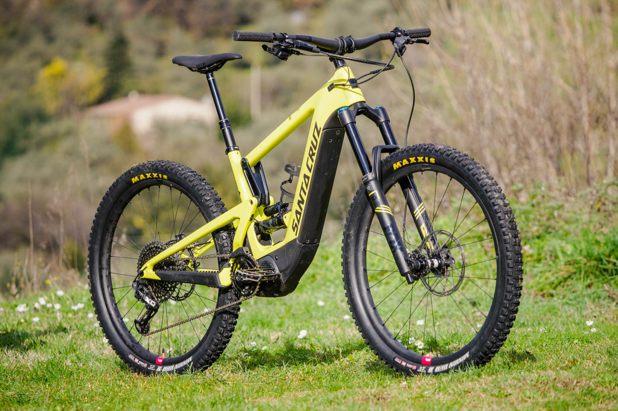 Côté équipement, Santa Cruz a fait le choix des composants « e-bike », sans tomber dans l’excès. Des disques de 200mm de diamètre sont installés et, côté train roulant, Santa Cruz installe sa roue de DH à l’arrière pour le modèle le plus haut de gamme. À l’avant, c’est une Reserve carbone « traditionnelle » de 30mm de largeur interne qui est utilisée. Toujours côté train roulant, des pneus Maxxis Exo+ sont installés en section 2.6.