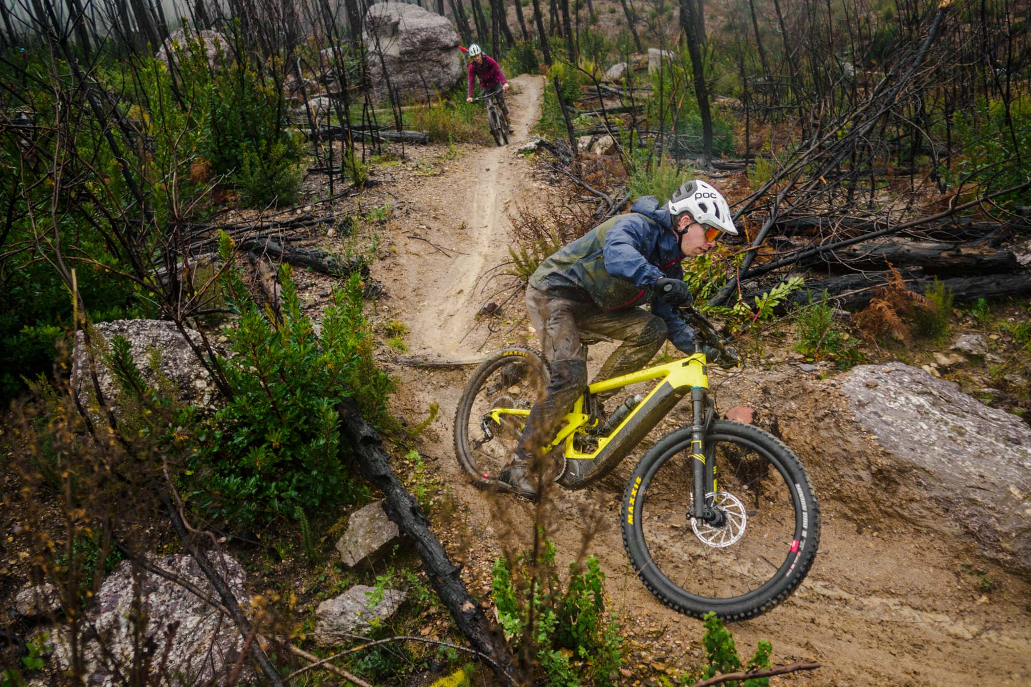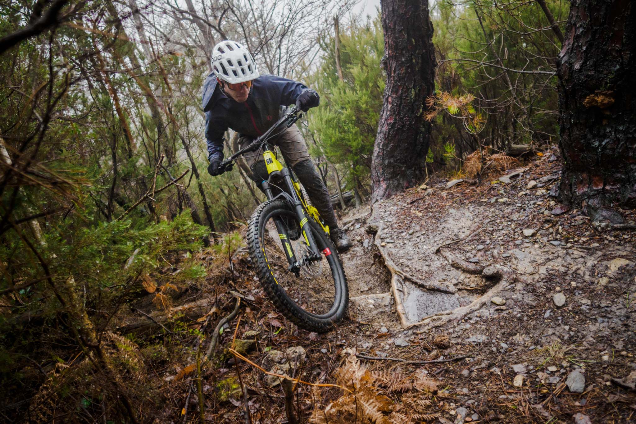 Dans les portions plus travaillées, on pousse sur le vélo qui reste bien en ligne et on le bouge facilement tant qu’il ne faut pas décoller les roues du sol. Le réglage de compression « light » de l’amortisseur nous permet de garder un super contact au sol, même quand on avance sur des oeufs sur ce terrain détrempé. On met de l’angle facilement et le vélo bouge bien entre nos jambes.