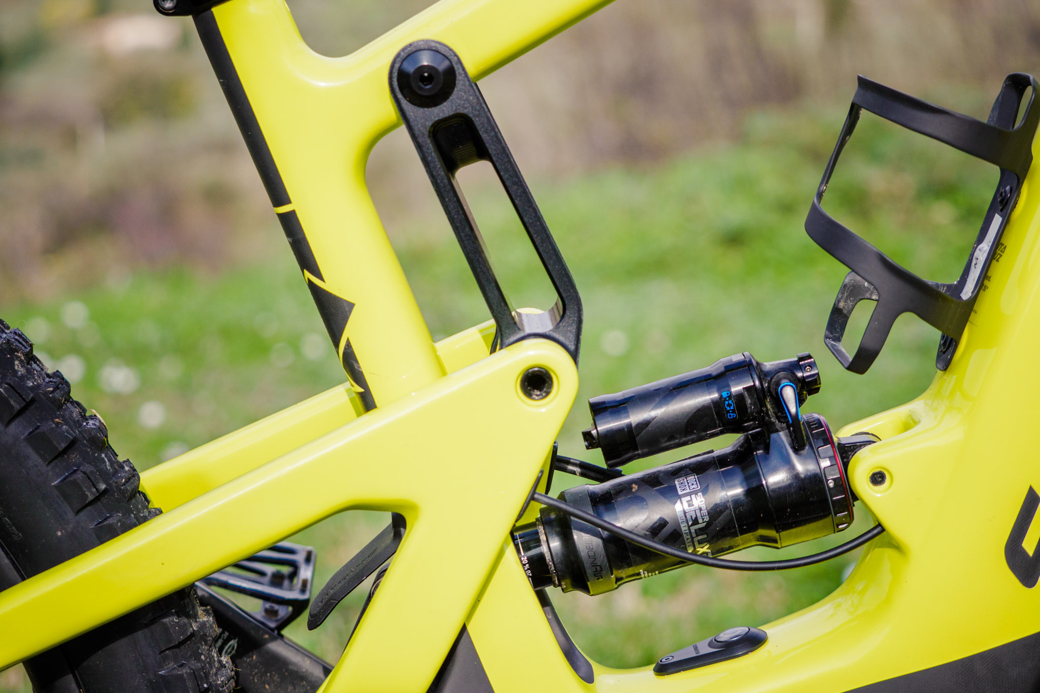 En s’attardant sur le vélo, point par point, on remarque déjà son cadre (garanti à vie) tout en carbone CC (le plus haut de gamme, et seule finition disponible sur ce Heckler) qui intègre un certains nombres d’éléments caractéristiques de ce nouveau type de vélo. Le bouton de démarrage du moteur tout d’abord, intégré élégamment sous l’amortisseur. Le capteur de vitesse ensuite, intégré à l’intérieur de la base.