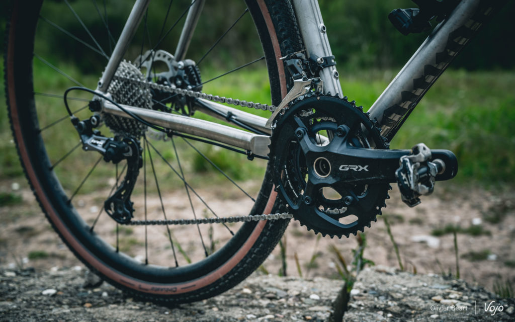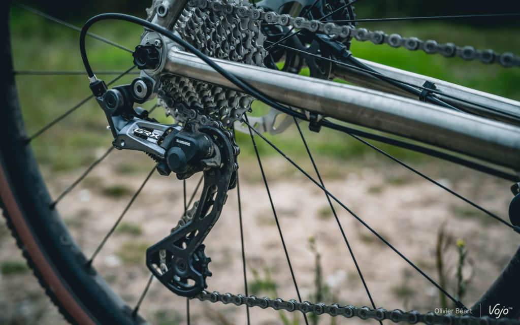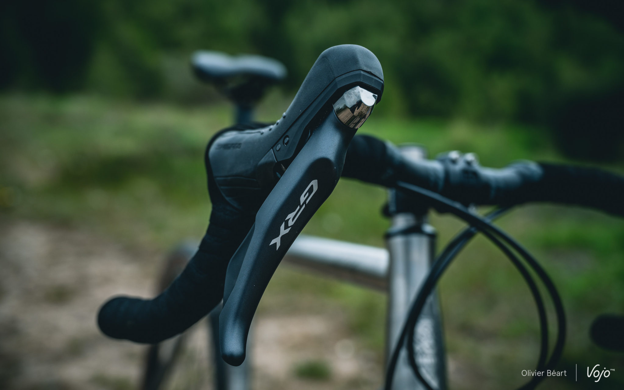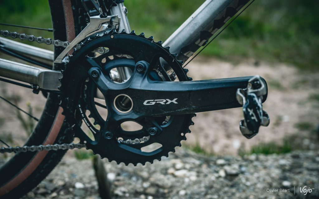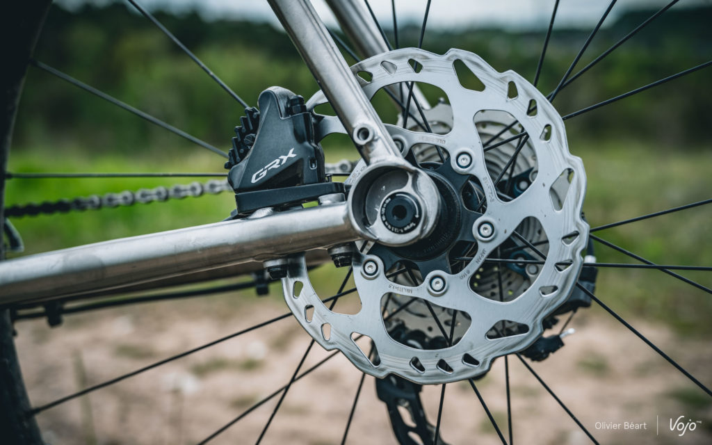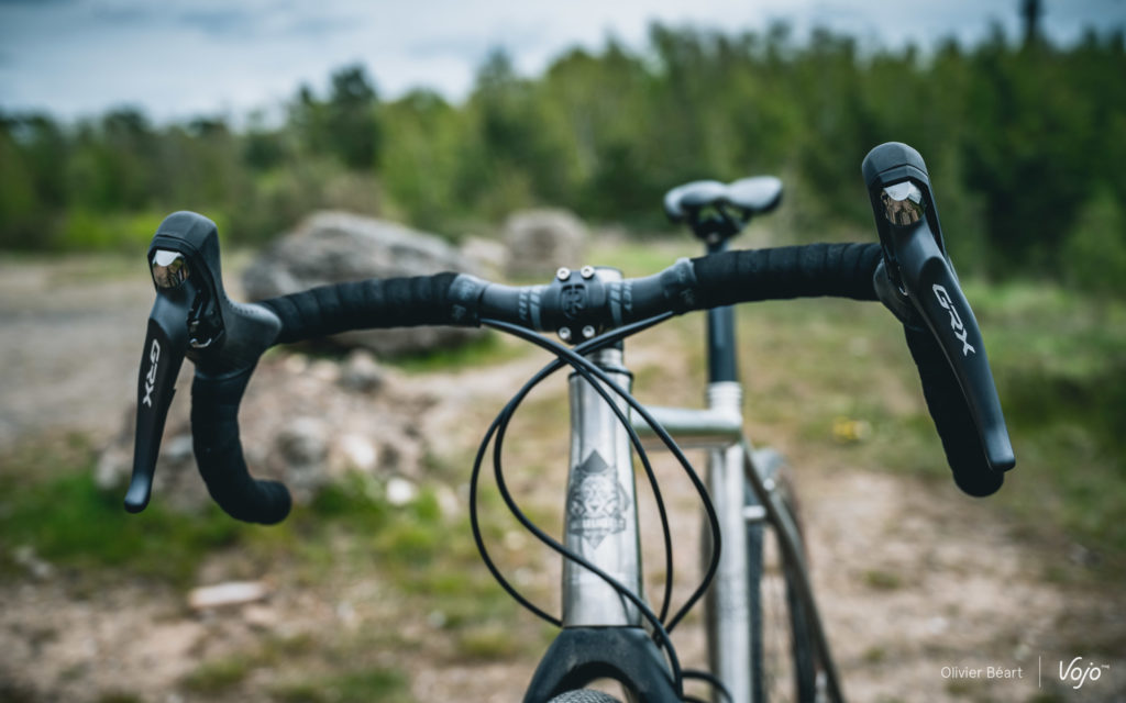Du côté de la transmission, Sauvage propose du Shimano GRX, en série 600 de base (mono ou double sans supplément), et en série 800 en option (+201€). Sur demande et en cas de pénurie, on nous souffle dans l’oreillette que d’autres options sont envisageables aussi. Quant au pédalier, c’est en principe un original Praxxis alu qui est monté, mais sur notre modèle d’essai il s’agissait d’un GRX. Nous avons eu un montage double plateau, et même si nous sommes de grands fans du mono en VTT, pour le gravel nous avons toujours une petite préférence pour le double grâce à la polyvalence qu’il offre et au meilleur étagement des rapports qu’il permet. Les freins sont aussi des Shimano GRX, à disque bien entendu.