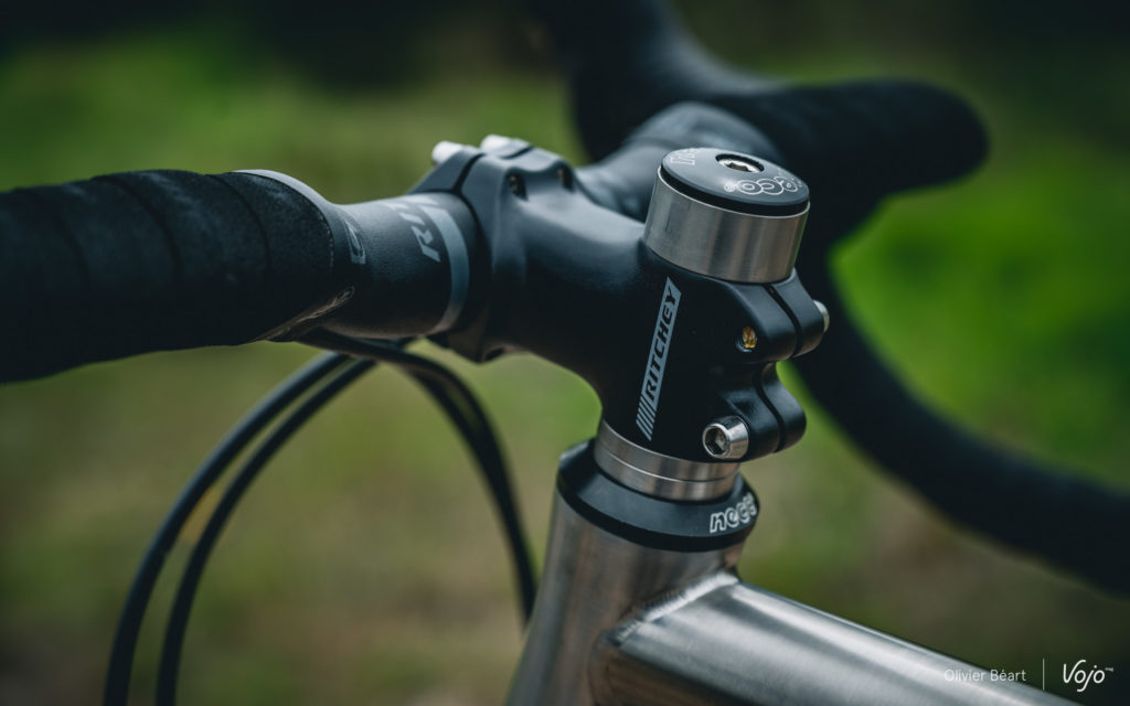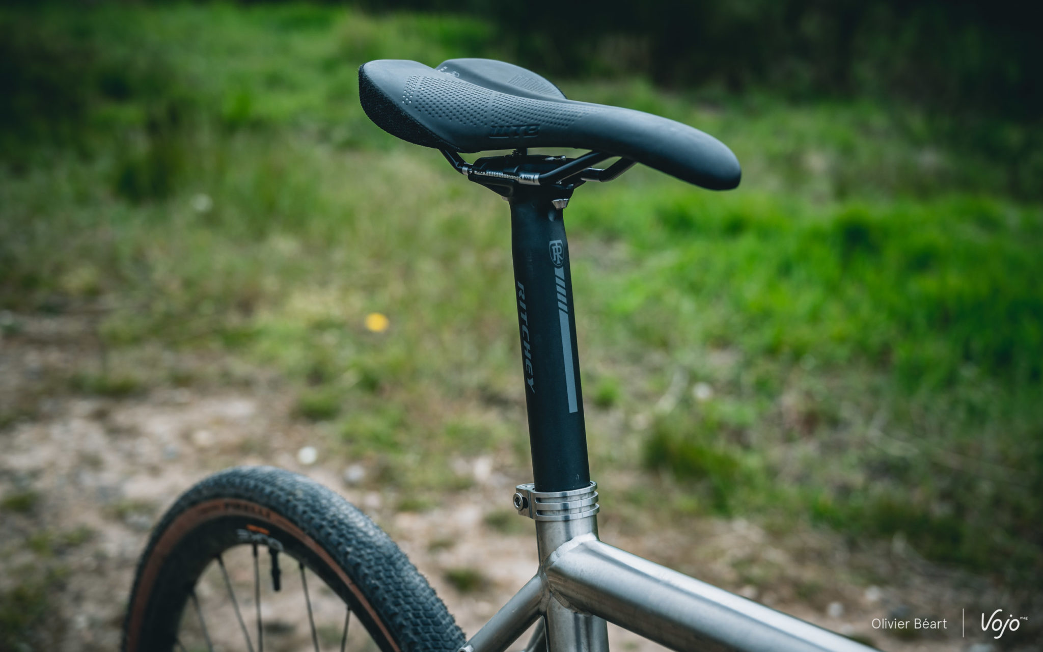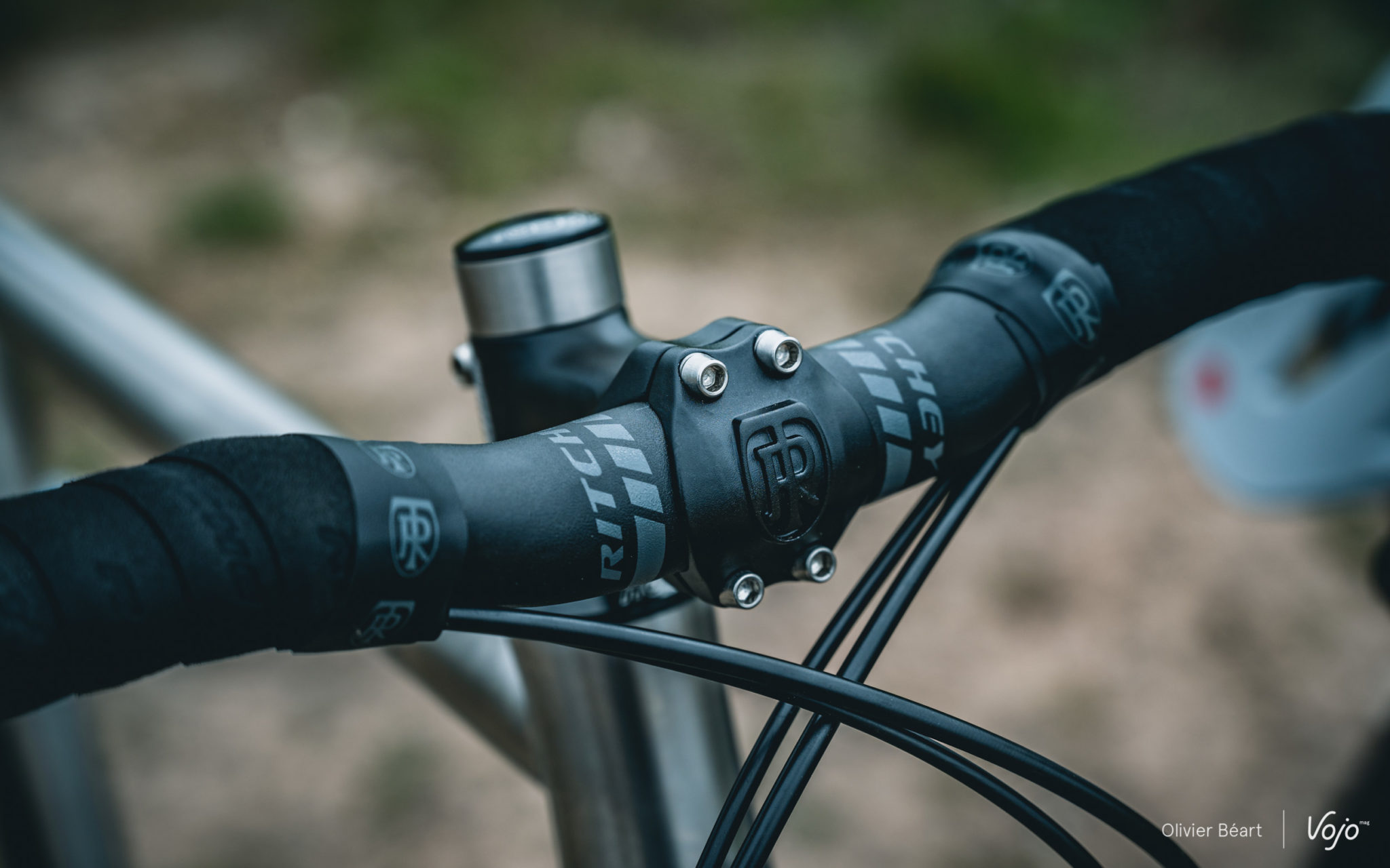 De base, le montage prévoit des périphériques Ritchey en alu, avec un collier de selle Hope (remplacé ici par un modèle en titane). Une tige de selle titane est disponible en option (141€) et peut permettre d’apporter un peu plus de raffinement au vélo, tant sur le plan visuel que de la filtration des vibrations. A noter aussi que le cintre Ritchey est le modèle Ergomax à la forme assez particulière, que nous avons beaucoup apprécié comme vous le verrez plus loin. La potence est très courte pour un vélo de gravel, et s’inspire de ce qui se fait en VTT, dans le prolongement de la géométrie un peu atypique du vélo.