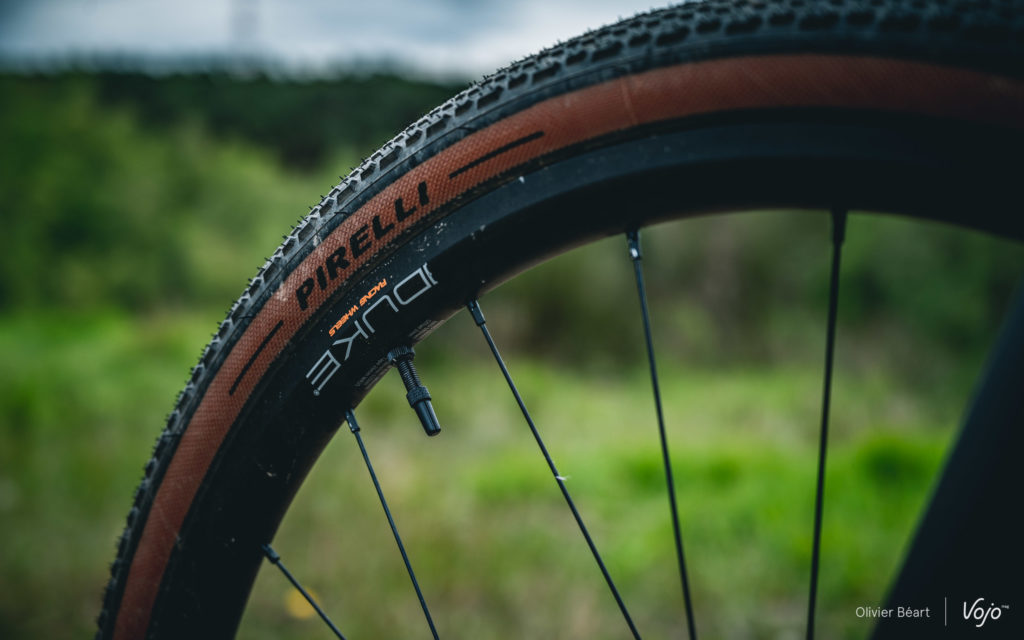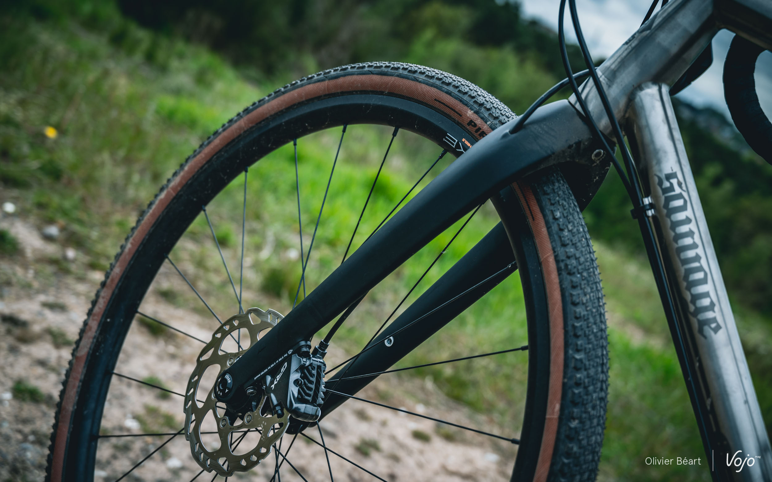 Le train roulant mérite aussi qu’on s’y attarde, car Sauvage a fait le choix de produits issus d’un monteur et concepteur de roues français bien connu : Duke, avec le modèle World Runner. Si les moyeux sont des (bons) génériques asiatiques, le montage/rayonnage est très soigné et on trouve des jantes maison en 25mm de largeur interne. Le tout donne une paire de roues tolérante tout en ayant du caractère et en étant légère (1588g la paire selon le constructeur). Leur comportement nous a en tout cas vraiment séduits et elles complètent magnifiquement le châssis Sauvage. Quant aux pneus, il s’agit en principe de gommes Hutchinson mais notre vélo de test était équipé d’excellents Pirelli Cinturato qui se sont montré polyvalents, solides et dont nous avons beaucoup apprécié le toucher de terrain très feutré offert par leur carcasse à la souplesse très bien dosée.