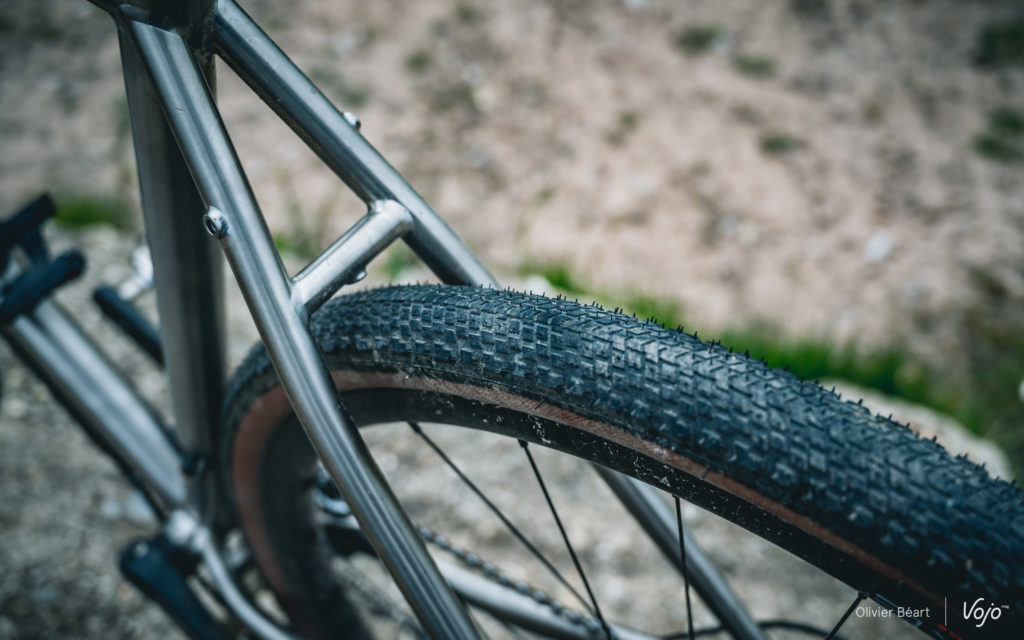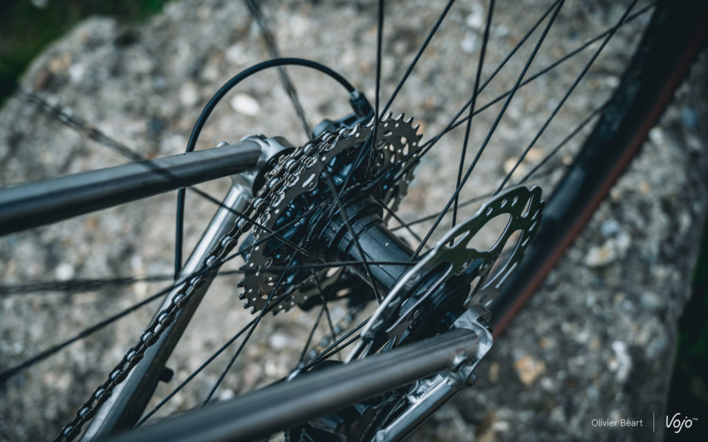Simplicité et adaptabilité sont deux maîtres-mots pour la conception ; l’idée étant d’aller chercher la qualité du comportement du vélo ainsi que sa personnalité dans la mise en œuvre des tubes et dans la géométrie de la machine, mais en restant dans des standards simples et connus. On trouve donc un boîtier de pédalier fileté fiable et plus simple au montage, un axe de roue arrière en 142×12 qui permet d’utiliser un large panel de roues (650 ou 700c, en 48 ou 45mm de large respectivement), ou encore un passage des câbles et Durit discret et bien pensé mais à l’extérieur du cadre, toujours dans cette idée d’éviter les prises de tête.