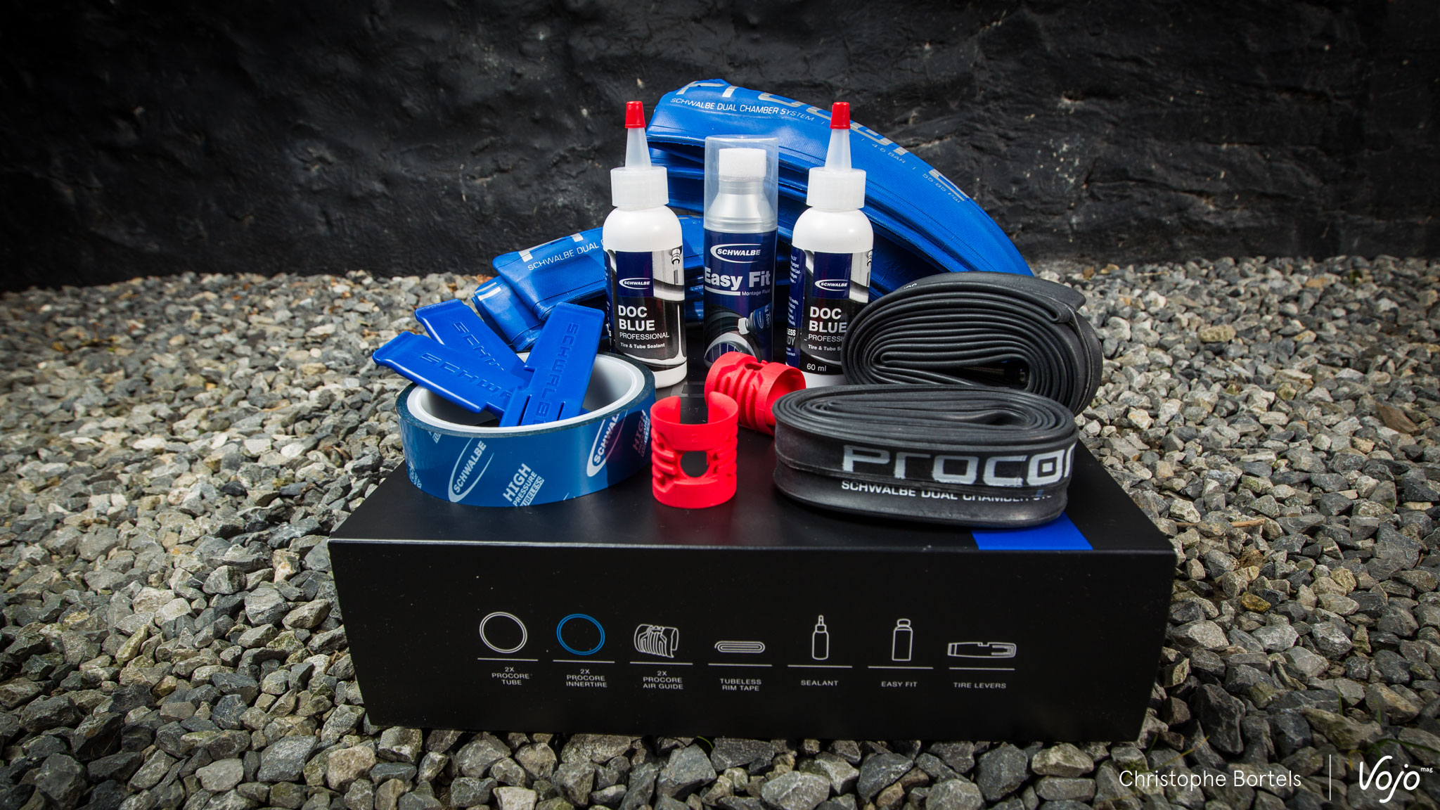 Avant d’aborder le montage et nos impressions sur le terrain, commençons pour une fois par le tarif. Prix public pour un kit permettant de convertir deux roues : 195€. Ouille… Oui, mais pour cette somme, Schwalbe se montre heureusement généreux et propose un kit très complet comprenant le Procore en lui-même pour deux roues (les « pneus route » bleus, donc), deux chambres avec la fameuse valve spéciale, deux « Airguide » (la pièce rouge qui guide le flux d’air venant de la valve quand on gonfle le gros pneu), du fond de jante, deux flacons de liquide étanchéifiant (latex), du liquide Easy Fit pour lubrifier les tringles et aider le pneu à « monter », trois démonte-pneus spécifiques et des stickers à coller sur la jante, autour de la valve, rappelant dans quel sens manipuler la valve pour gonfler l’une ou l’autre partie du système (l’ensemble chambre à air/pneu bleu à haute pression ou le pneu tubeless à basse pression).