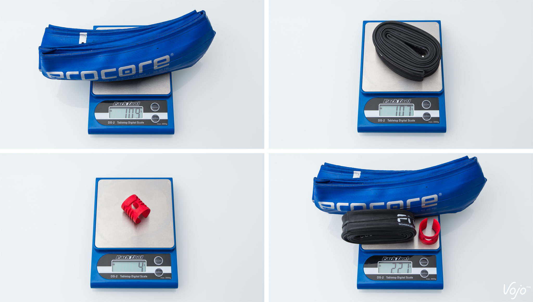 Nous en avons bien sûr profité pour peser les éléments ensemble et séparément avant le montage. Verdict pour un trio pneu/chambre/Airguide : 221 grammes en version 27.5. Comme on le voit, le Procore et la chambre affichent quasiment la même valeur sur la balance, à savoir respectivement 109g et 107g, l’Airguide ne pesant quant à lui que 4g. Disons-le d’emblée, ces 221g par roue peuvent sembler beaucoup, mais nous les avons à peine ressentis pour un usage enduro. Au niveau de la prise de poids, c’est en réalité un peu comme si on roulait en ayant placé une chambre à air bien solide après avoir crevé en tubeless…