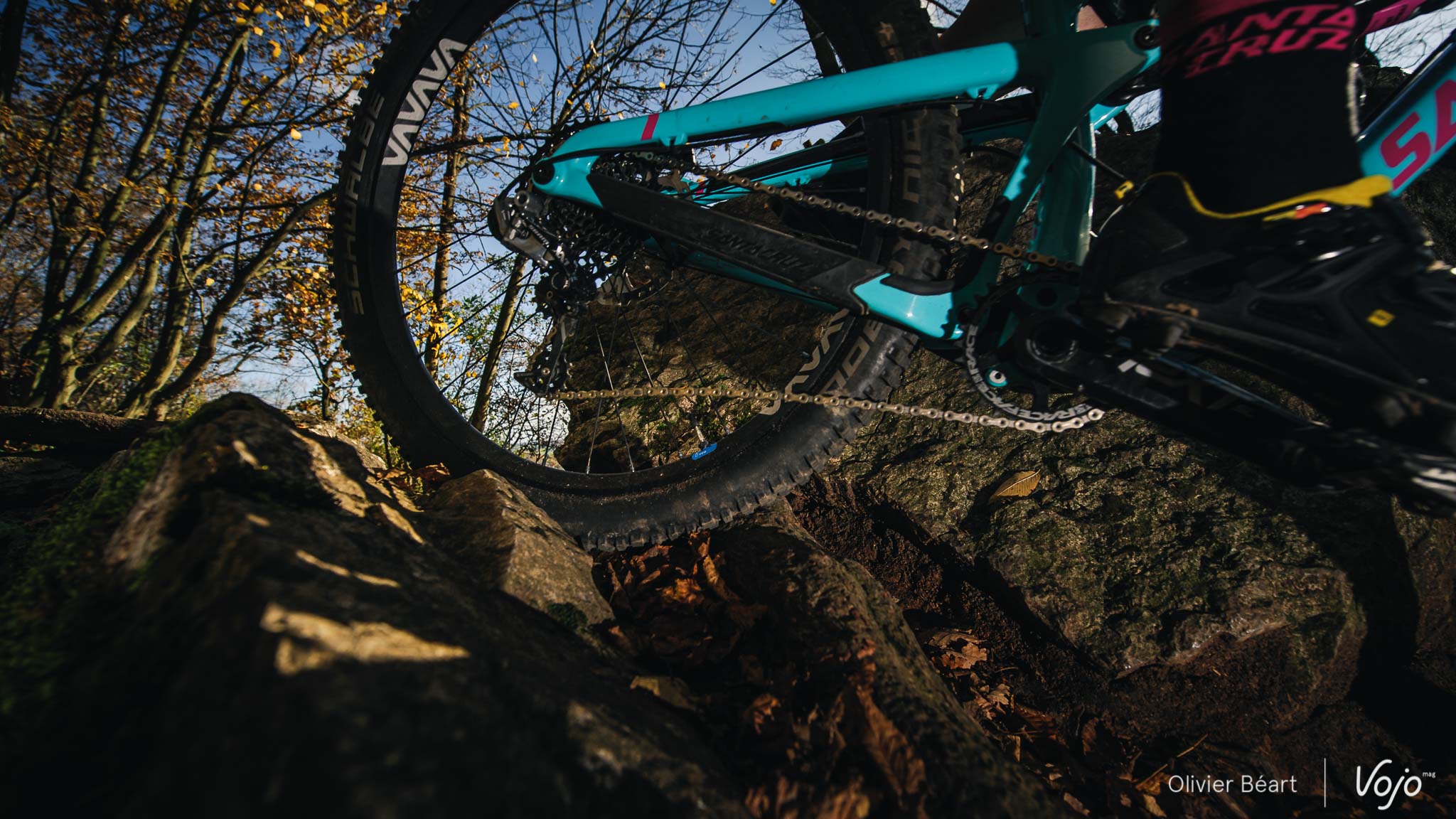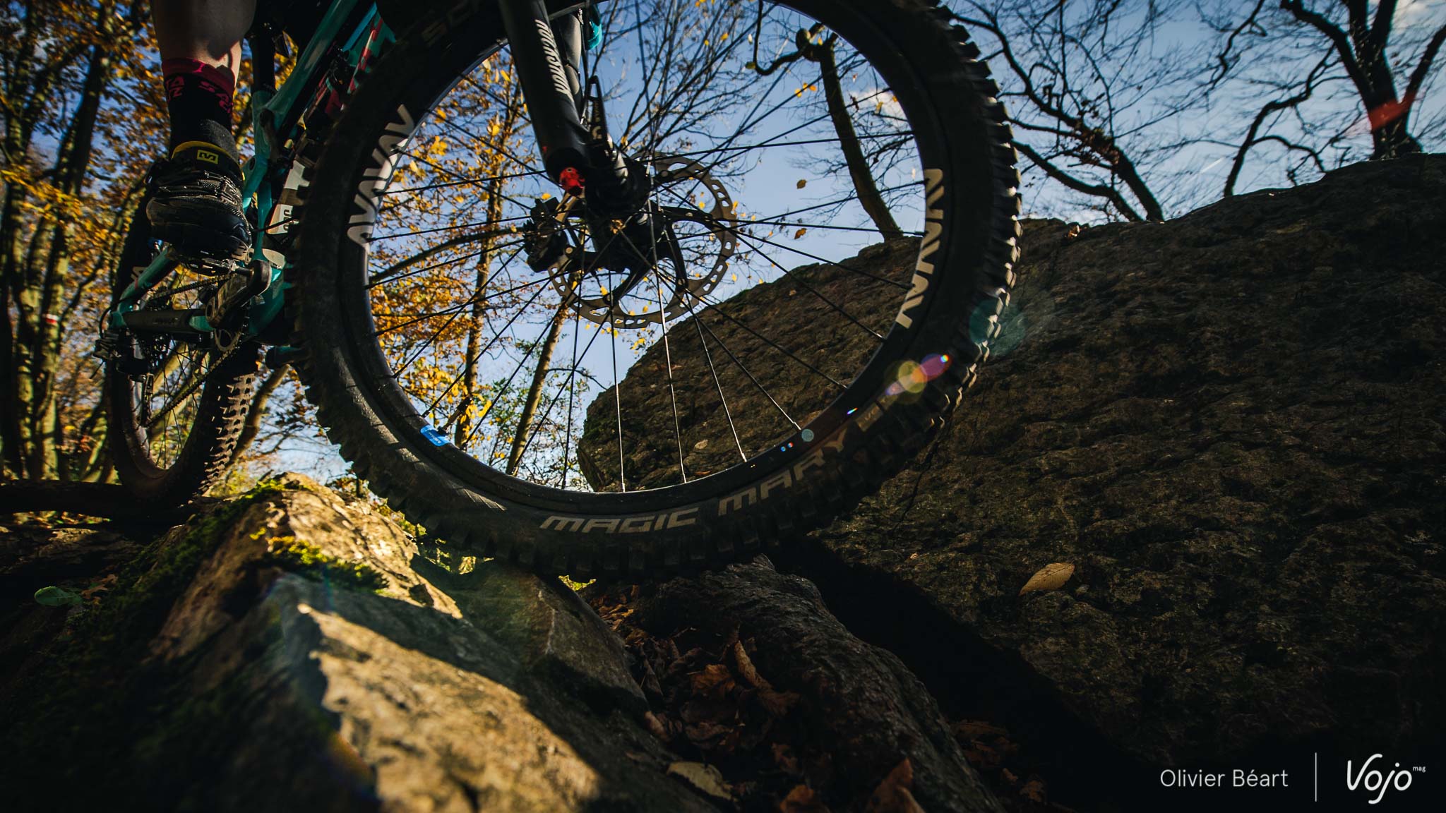 L’accroche est donc phénoménale à l’avant, mais aussi à l’arrière, ce qui se ressent davantage encore en côte. Alors qu’un pneu arrière gonflé à une pression habituelle aura souvent tendance à « rebondir » sur les racines, pierres etc, on sent ici que le pneu épouse les obstacles et adhère sur tout ce qu’on lui met sous les dents, offrant une motricité démoniaque. Une fois qu’on est habitué au bruit parfois terrible de la gomme qui se déforme et accroche sur tout, ce n’est que du bonheur ! Mais tout ça ne se fait-il pas au détriment du rendement pur sur route ou chemins roulants ? Eh bien non, étonnamment et contrairement à ce qu’on pourrait craindre, malgré la basse pression on n’a jamais l’impression d’être collé au sol.