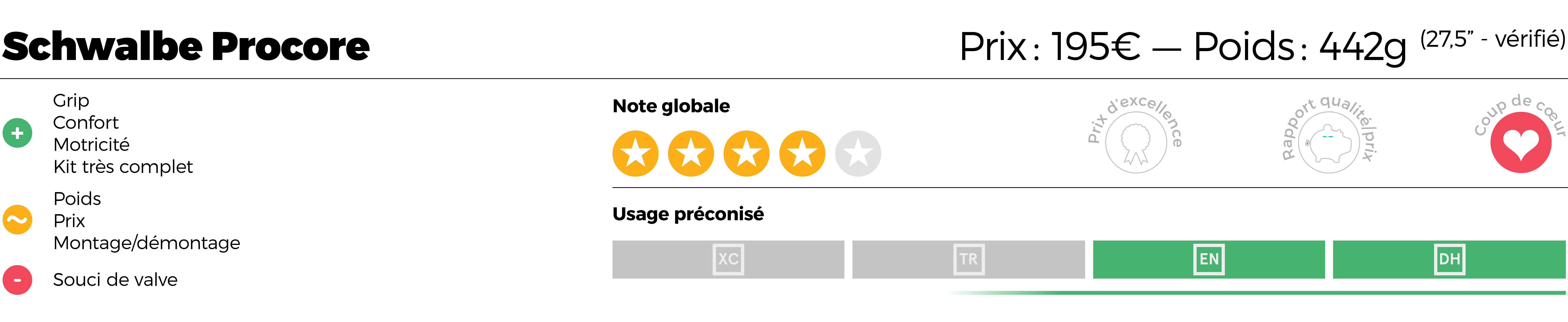 Trop lourd pour le XC, le Procore est par contre taillé pour les pratiques gravity comme l’enduro et la descente où il offre des tonnes de grip, de confort et de sérénité tout en protégeant parfaitement la jante. Le montage/démontage demande un peu de patience mais n’est pas aussi compliqué qu’on pourrait le craindre, seuls des soucis de valve encrassée sont finalement venus ternir un tableau quasi parfait. Alors, une révolution ? On n’en est pas loin !