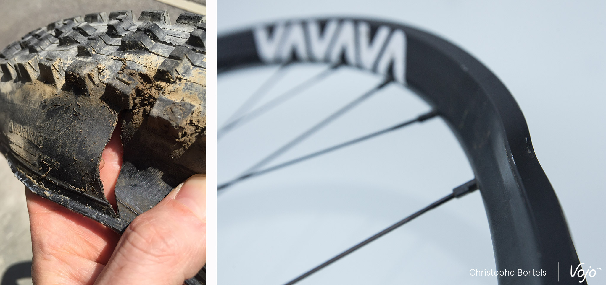 Un autre problème est apparu quand il a fallu remplacer notre Rock Razor, victime de grosses épines italiennes et d’une petite déchirure naissante : démonter le système s’est en effet avéré aussi compliqué que de le monter, ici aussi en grande partie à cause de la jante Ryde récalcitrante. L’opération s’est faite chez nous, au calme, mais sur le terrain, a fortiori en course, c’eut été une autre paire de manche… Sans compter que, en cas de grosse crevaison/déchirure en tubeless traditionnel, il suffit de monter une chambre à air et on est reparti, alors qu’avec le Procore on doit d’abord retirer la chambre, le pneu bleu et le Airguide avant de monter la chambre à air de secours. Et qu’il faut aussi emporter dans son sac ou une poche de maillot le précieux kit Procore souillé par le liquide anti-crevaison… Ce cas de figure ne nous est heureusement pas (encore) arrivé.