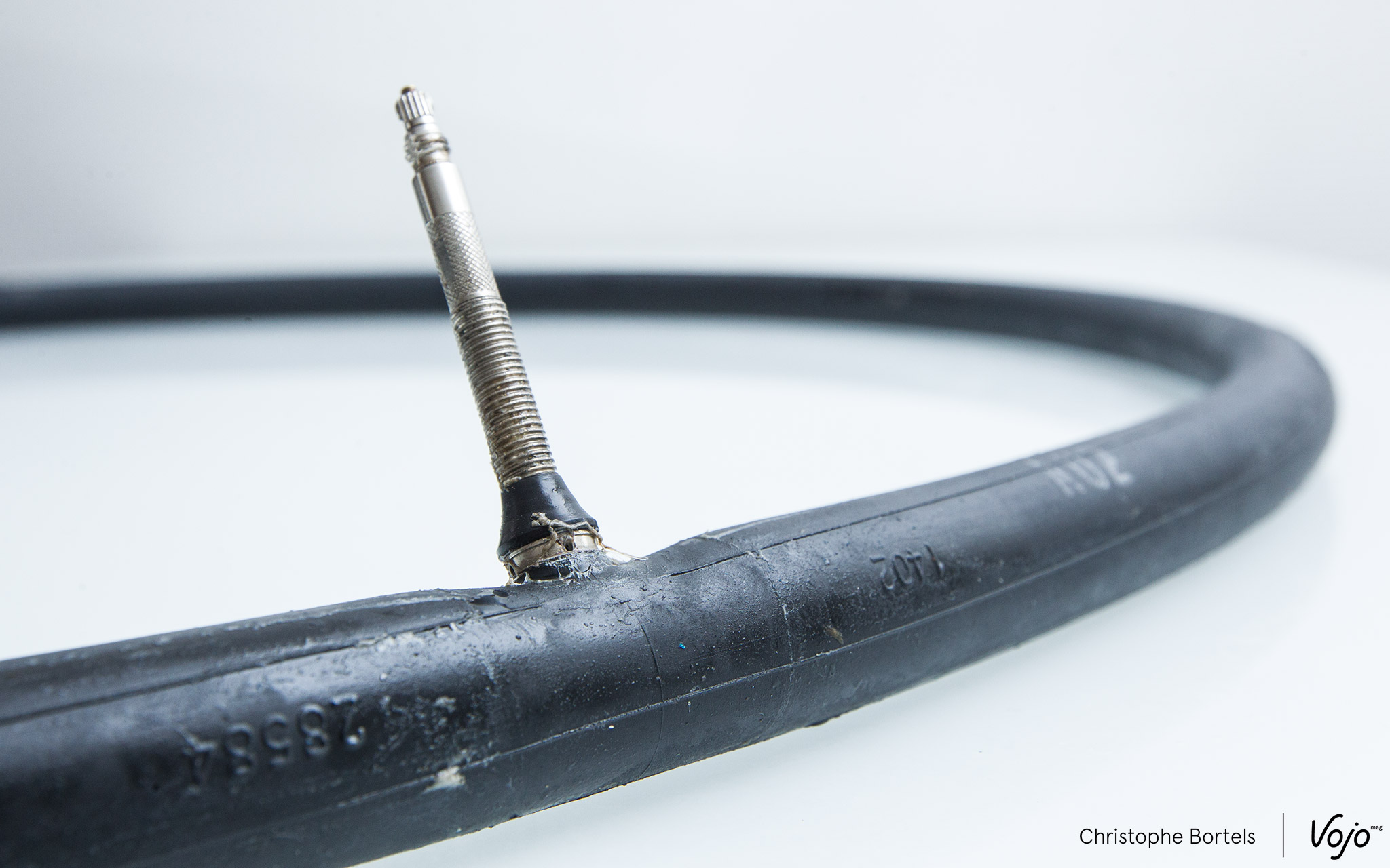 Comme promis par Schwalbe, accroche incroyable et confort royal sont bel et bien au rendez-vous. Le géant allemand du pneu nous aurait donc sorti un produit magique et sans défaut ? Eh bien non… Car après quelques semaines d’utilisation, notre pneu arrière est devenu particulièrement difficile à gonfler, tant au niveau de la partie Procore avec chambre que du gros pneu tubeless. C’est comme s’il n’y avait plus assez d’air qui parvenait à passer par la valve lors du gonflage. Un démontage et nettoyage de l’obus n’y changeront hélas rien, l’encrassement (par du liquide anti-crevaison séché sans doute) se situant dans la partie non démontable de la valve. L’ennui, c’est qu’on ne peut évidemment pas remplacer la chambre du Procore par une chambre standard, il faut racheter le modèle spécifique avec la valve spéciale. Heureusement, cette pièce est proposée à la vente séparément, au prix de 19.90€. Pour info, si vous détruisez le pneu bleu, c’est pas moins de 59.90€ qu’il vous faudra débourser pour un nouveau. Heureusement, il semble solide.