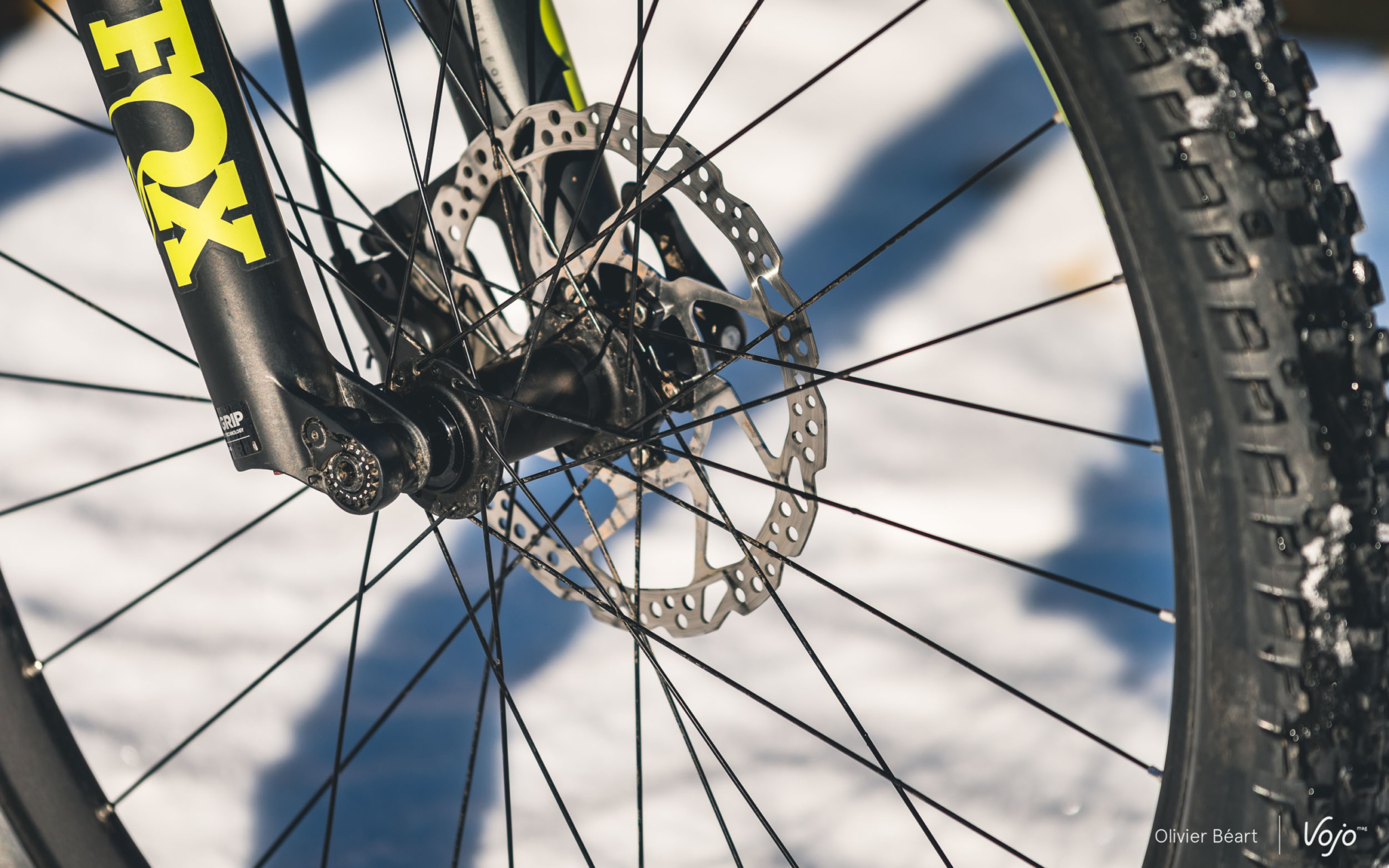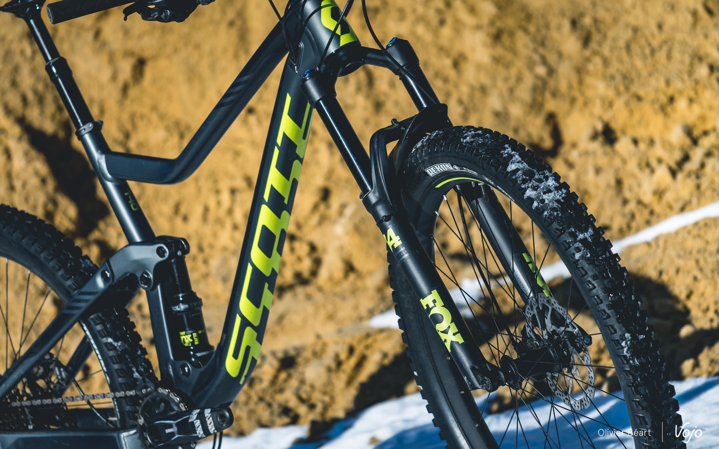 Les suspensions viennent de chez Fox avec le niveau de gamme Performance devant comme derrière. On l’a évoqué au chapitre suspension, mais l’amortisseur est un classique 3 modes et pas la version Nude spécialement développée pour Scott. A l’avant, la Fox 34 a aussi 3 positions pour la compression, et l’ensemble fonctionne vraiment de concert, même si par moments la fourche semble un peu dépassée par les capacités du vélo. Nous y reviendrons.