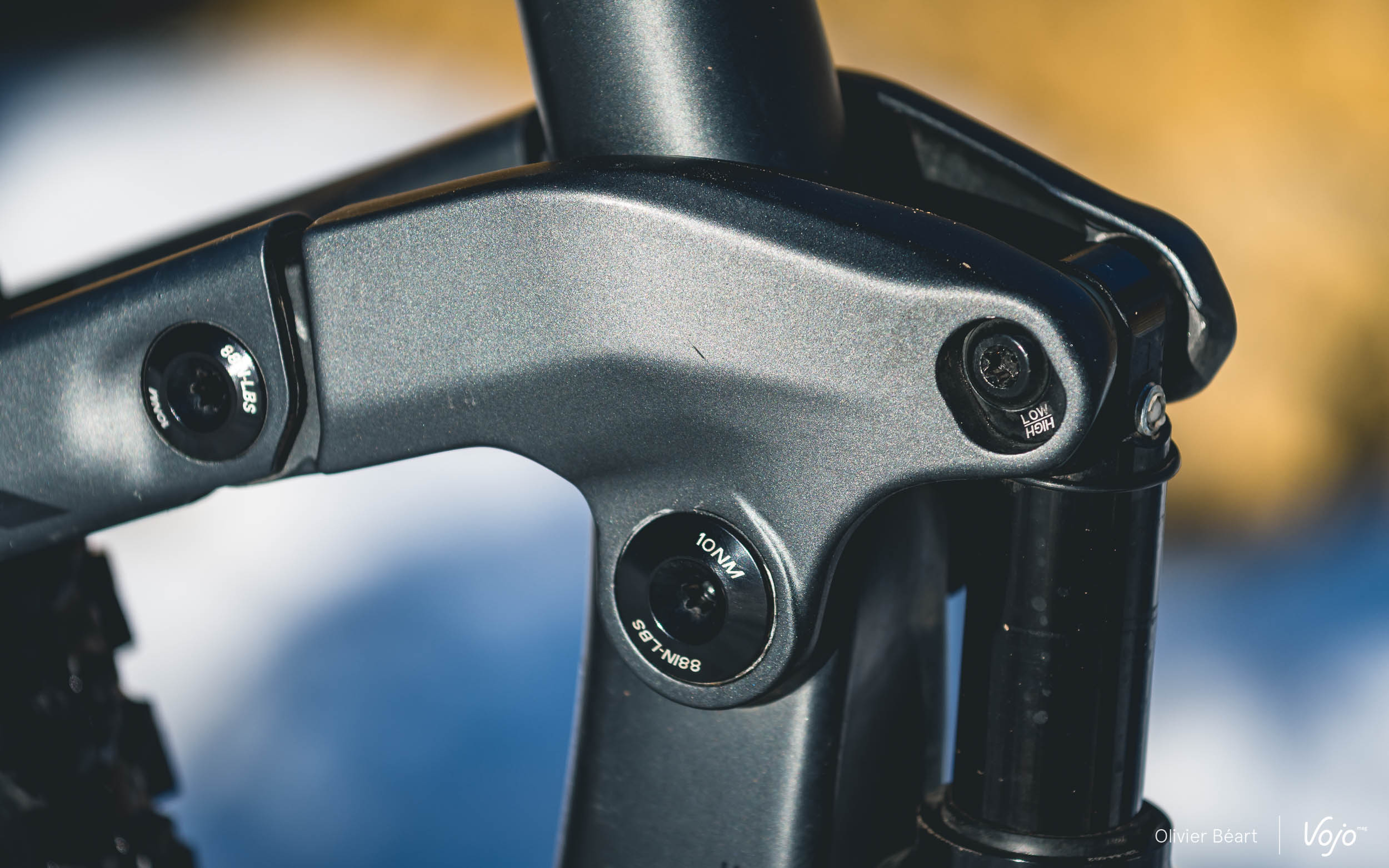 On remarque aussi que la biellette est équipée d’un petit excentrique afin de faire varier la géométrie. Ce n’est pas nouveau chez Scott et plusieurs générations de leurs vélos ont déjà été dotés de ce type de réglage, mais pour la première fois il prend ici tout son sens : adapter les angles (sur 0,4°) et la hauteur du boîtier (0,6cm) à la taille de roues choisie (sur l’ancien Genius, nous n’avons jamais compris à quoi servait réellement la position haute).