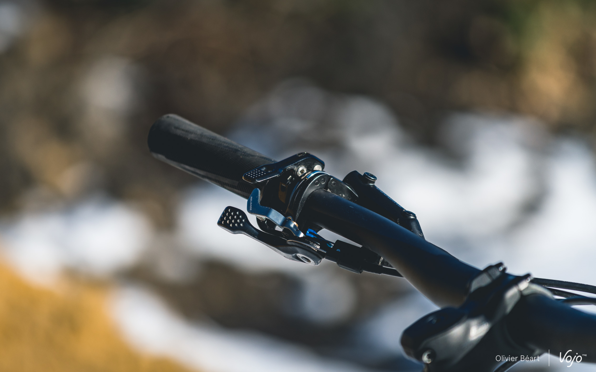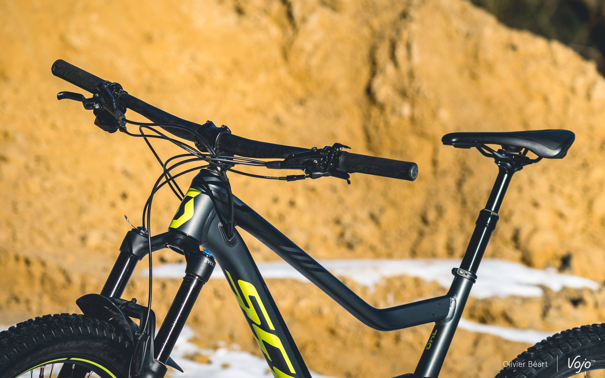 Le poste de pilotage signé Syncros, avec cintre de 760mm de large et potence de 50mm, est esthétique et ergonomique, alors que la tige de selle télescopique de la même marque (appartenant à Scott) fonctionne très dignement même si un peu de jeu est apparu en fin de test. Elle est en 100mm de débattement sur la taille S, 125 en M et 150 en L et XL. La commande au cintre est basique mais fiable et il est aussi possible de la régler de sorte à pouvoir activer le Twinlock en même temps que cette dernière, afin d’ouvrir les suspensions en même temps qu’on abaisse la selle. Malin !