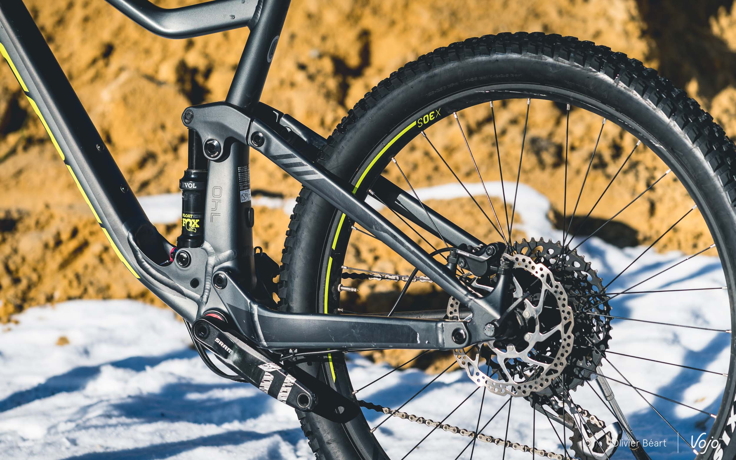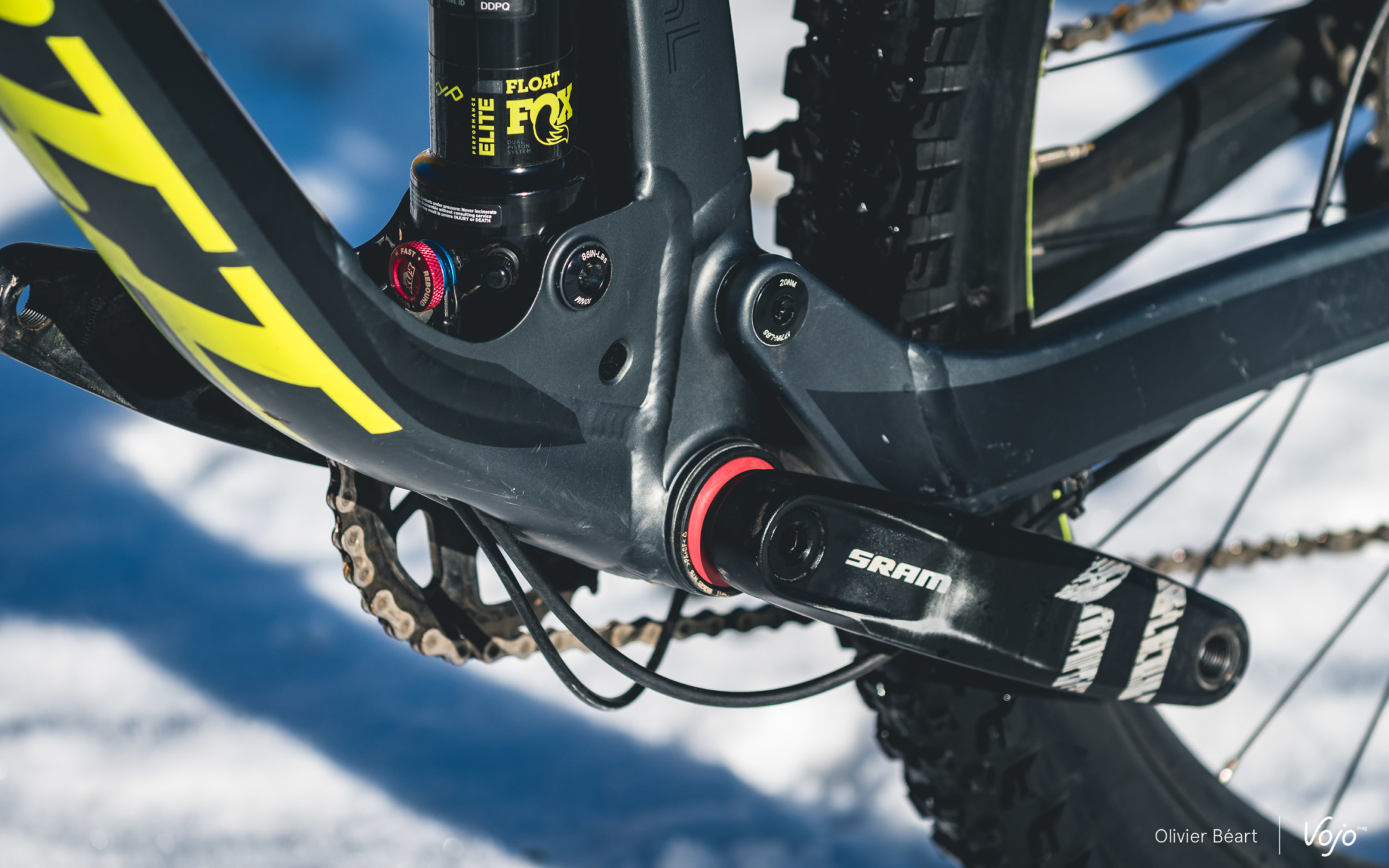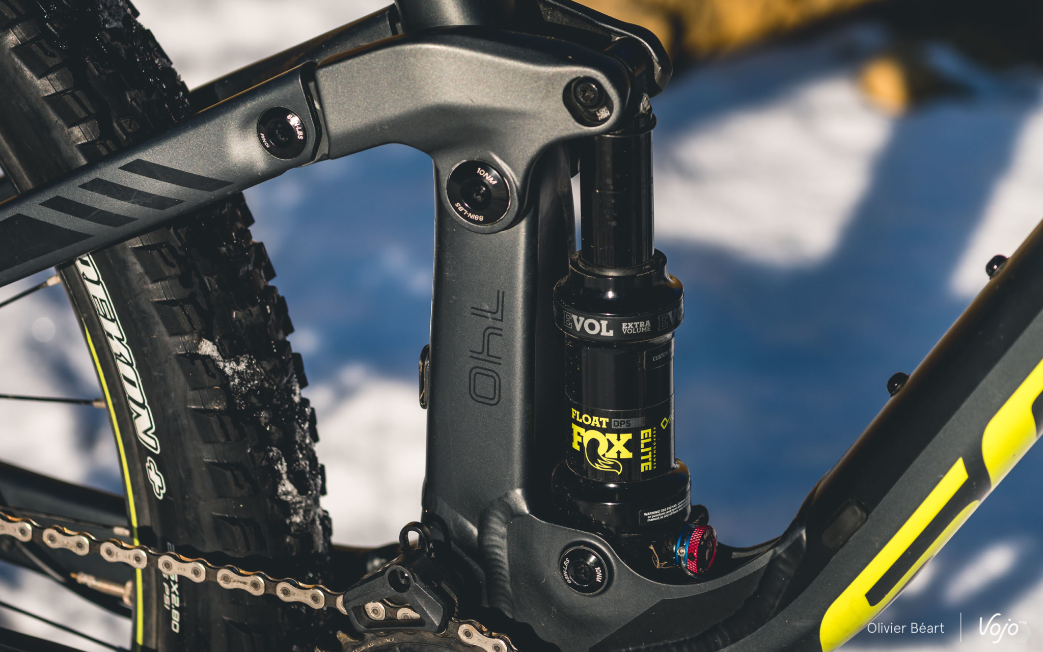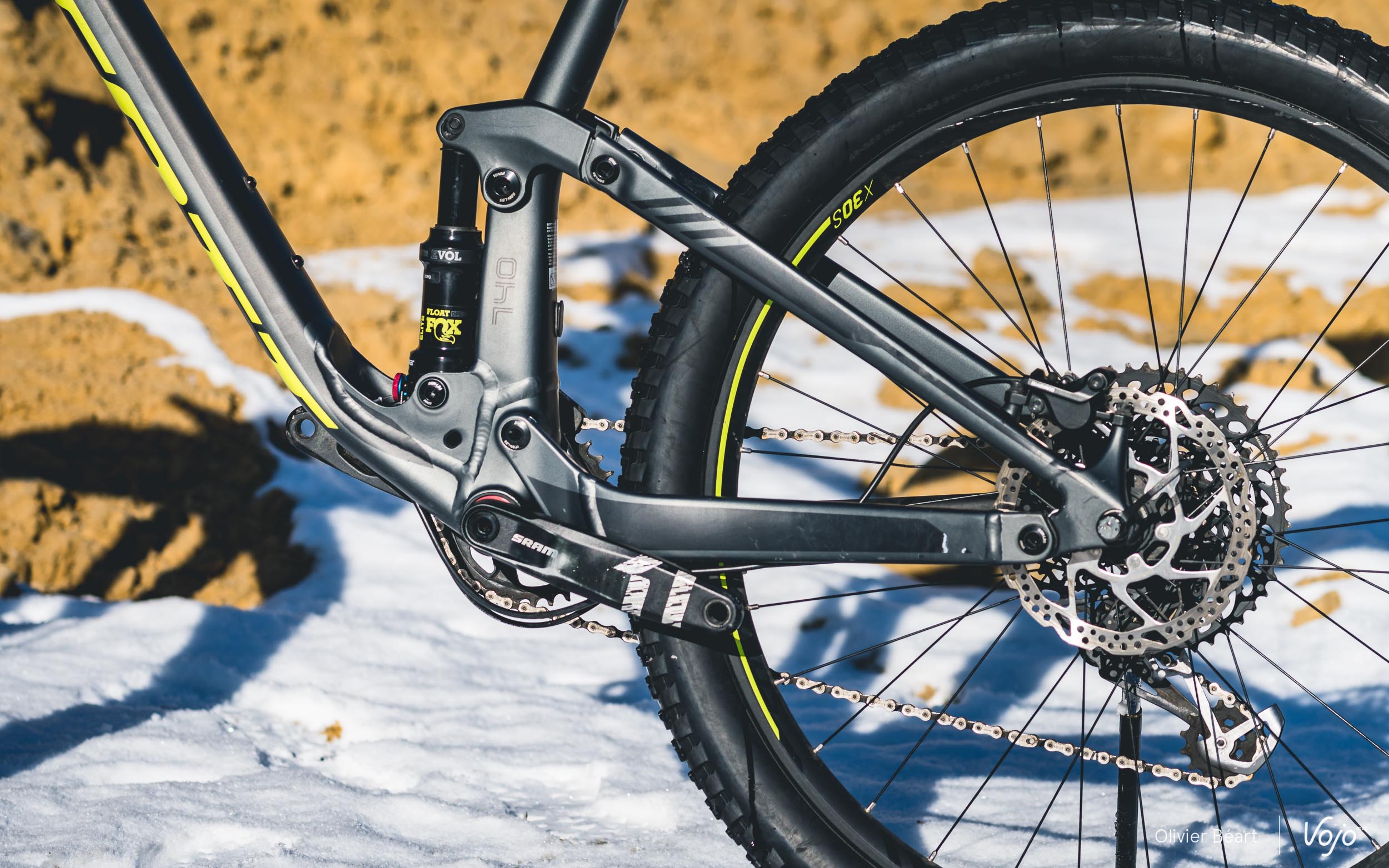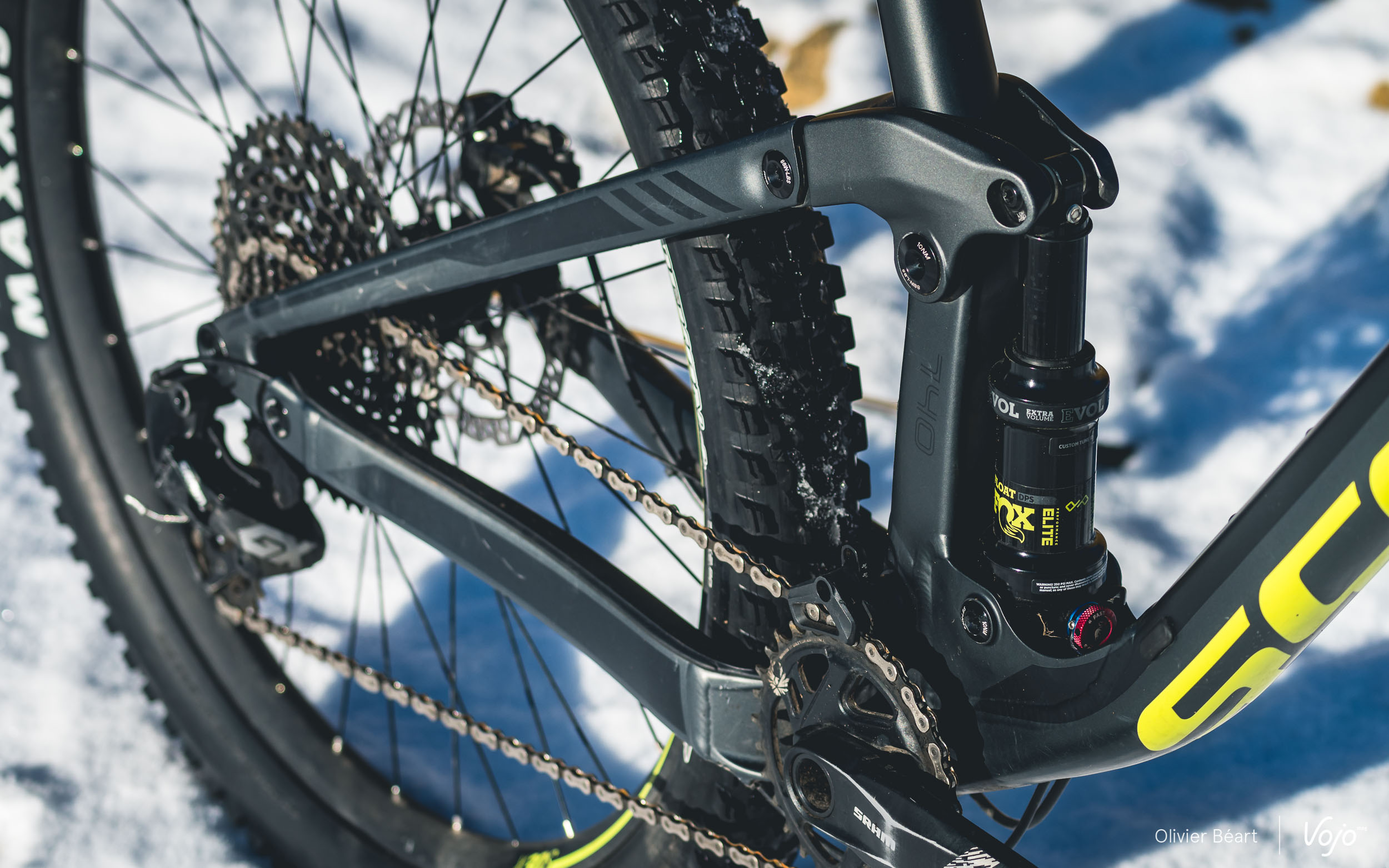 Ici, autant dire que Scott est reparti d’une page blanche par rapport à la précédente génération. Non seulement cela n’a plus rien à voir visuellement, mais au niveau de la cinématique non plus, puisqu’on passe d’un système de type mono+link à un four bar linkage à pivot horst link sur les bases.