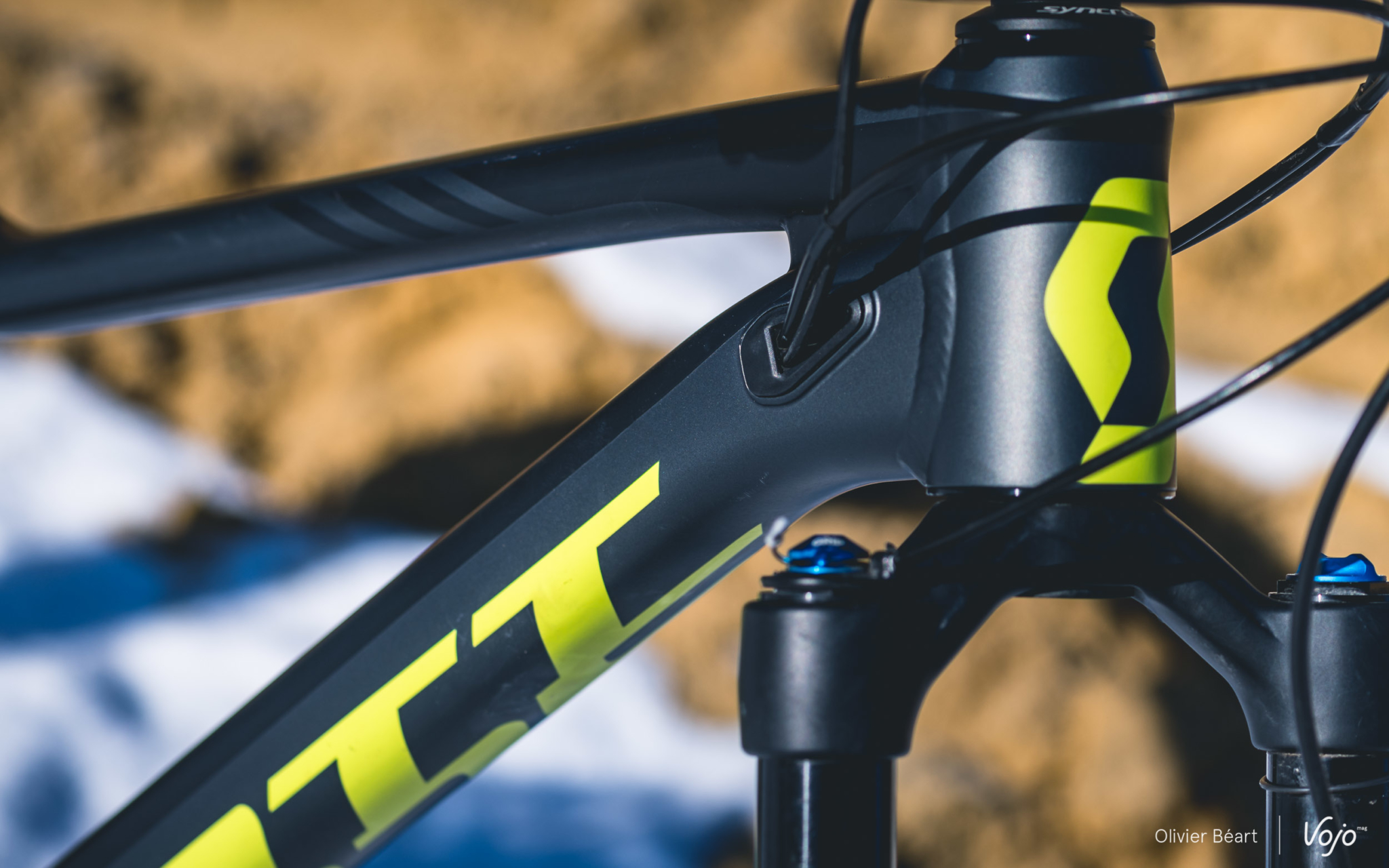 Sur notre Scott Genius 740, on se situe en entrée de gamme et on a donc un cadre entièrement en aluminium 6061 hydroformé, identique pour les 750/740/730. On dispose d’un cadre en carbone/alu à partir du 720 et seuls les Tuned et Ultimate ont un châssis full carbone. La principale différence va se situer au niveau du poids, Scott étant un champion en la matière sur ses modèles haut de gamme, alors qu’on va se situer ici plus dans la moyenne des gros cadres de trail (et donc assez généreusement au-dessus des 3kg).