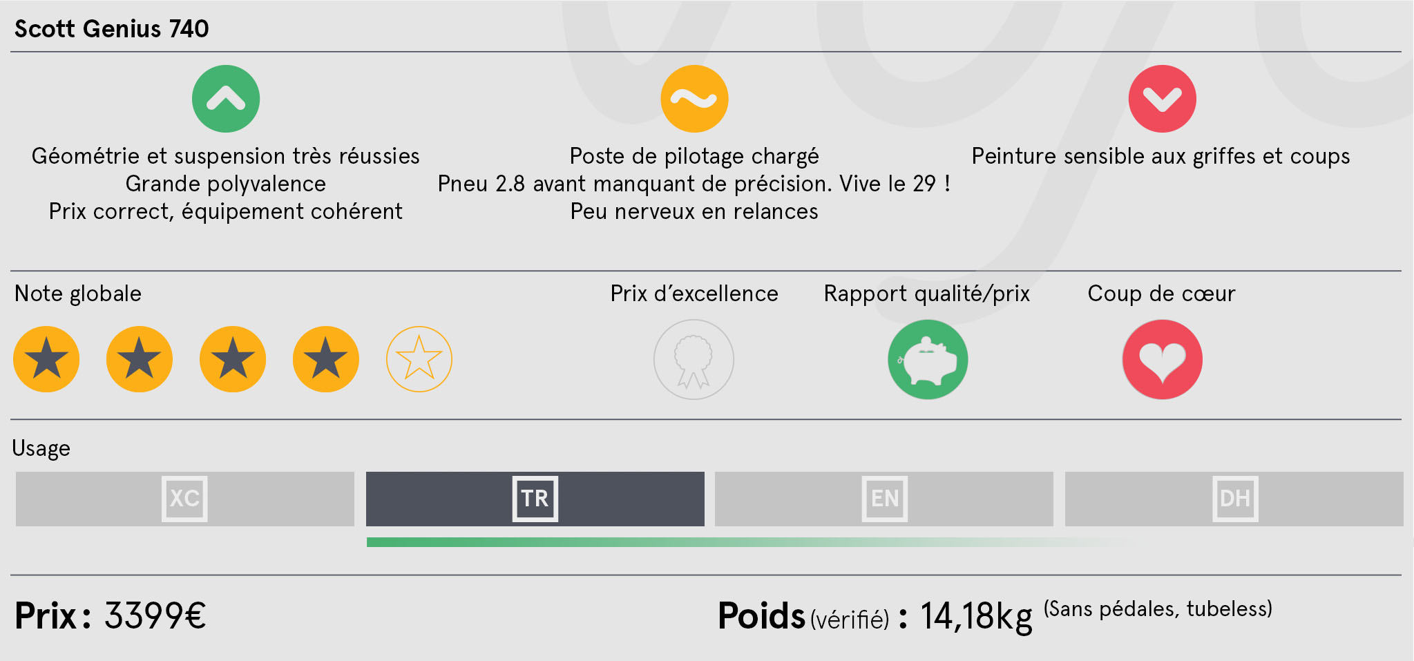 Malgré son châssis alu, ce Scott Genius 740 n’a rien d’une version au rabais et il permet déjà de goûter à la plupart des charmes de la famille. Les modèles carbone permettent sans doute de gagner un peu en nervosité et au pédalage, mais on est déjà sur un package très convaincant ici. Les améliorations par rapport à la précédente génération sautent aux yeux et ce nouveau Genius, bluffant à pas mal d’égards, se place clairement parmi les références des vélos polyvalents. Il se différencie du Spark 700 en offrant des capacités assez nettement supérieures en montagne ou pour un usage typé enduro, mais à l’issue de ce test, on se dit qu’il y a de la place dans la gamme pour une version encore plus musclée et engagée.