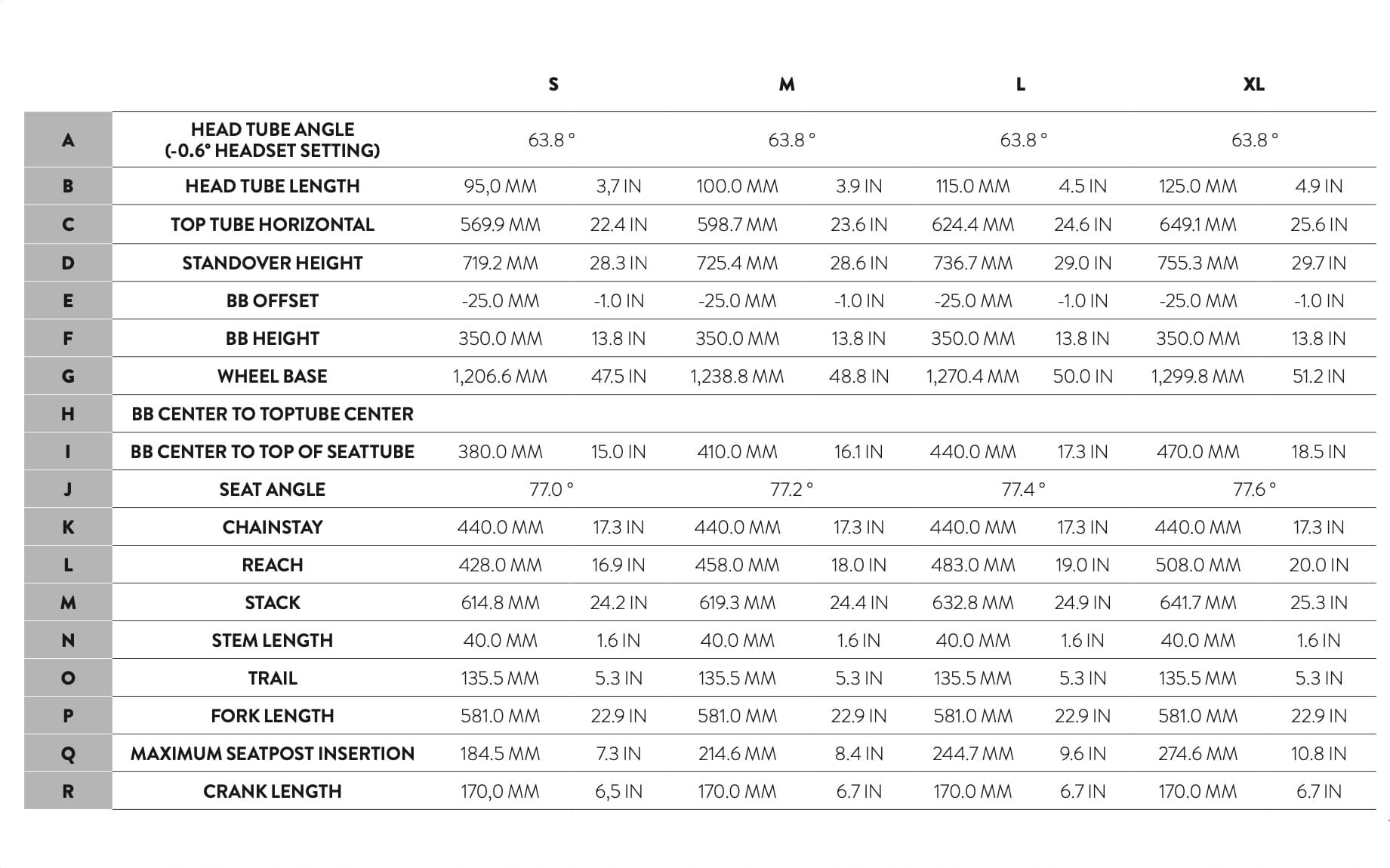 Cette géométrie est personnalisable sur deux niveaux. Le premier est celui qui permet le montage « mulet » et qui a pour conséquence de raccourcir les bases de 10mm (430 mm) et de descendre légèrement le boîtier de pédalier. Le second niveau de personnalisation se trouve à l’avant où il possible de choisir entre un angle de 65° (pour rendre le vélo le plus maniable possible), un angle de 63,8° (idéal pour la stabilité à haute vitesse) ainsi qu’un angle de direction intermédiaire de 64,4°. Le changement entre les deux premiers angles précités s’effectue en retournant les coupelles de jeu de direction, tandis que l’angle intermédiaire s’obtient en installant les coupelles fournies en supplément de série.