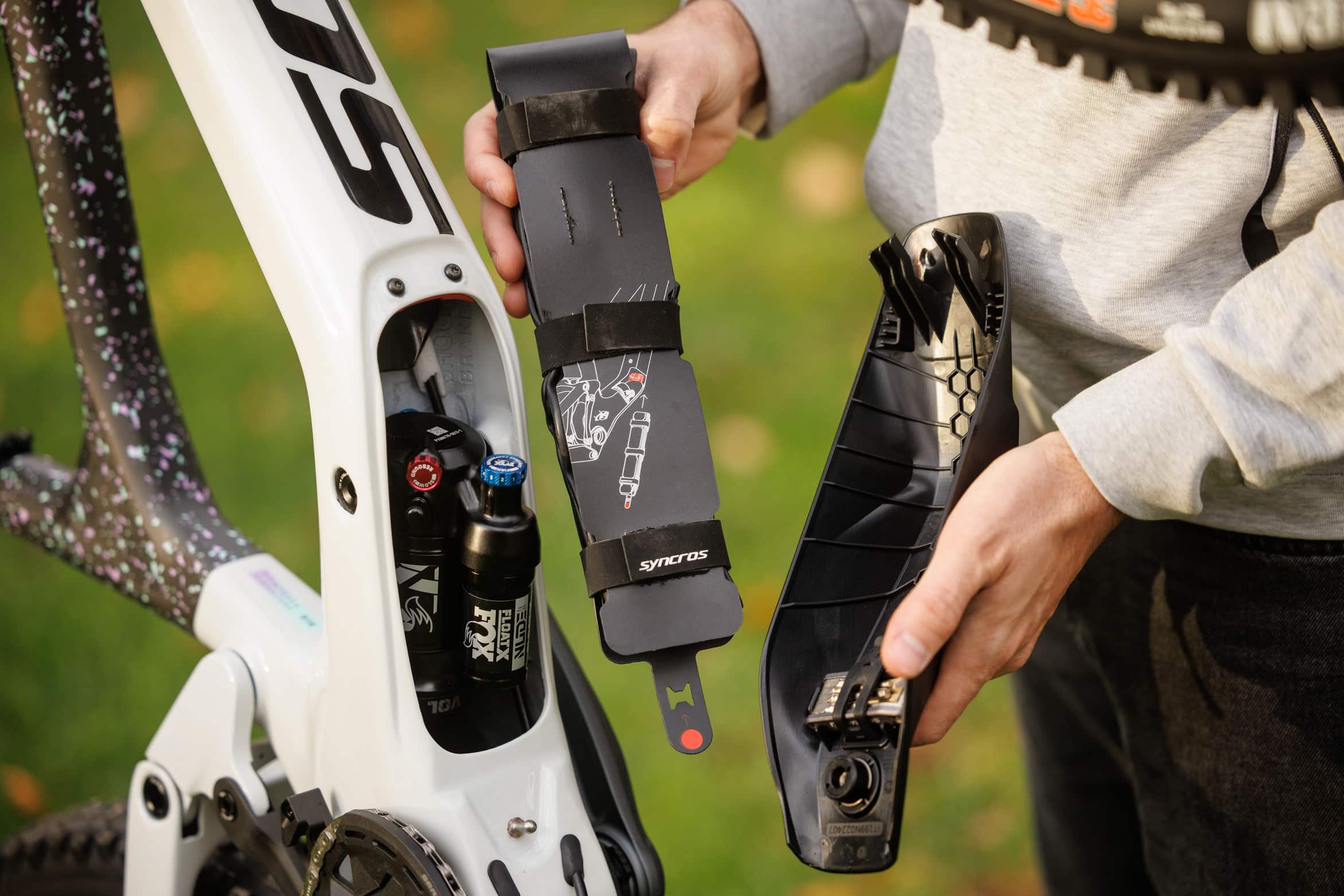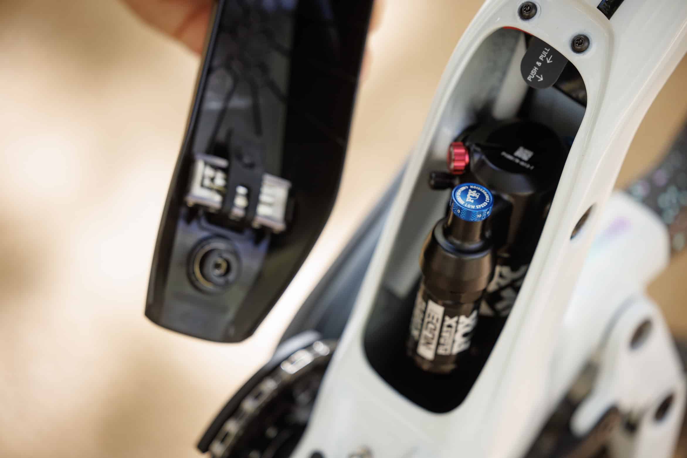 Comme pour les autres modèles à l’amortisseur intégré de chez Scott, c’est une trappe sous le bas du tube diagonal qui permet d’accéder à l’amortisseur. Cette porte en plastique remplit dans le même temps le rôle de fusible : en cas de choc sur le bas du cadre, c’est cette protection en plastique qui va réceptionner l’impact pour protéger le cadre. « Nous avons effectué beaucoup de tests d’impacts. Il faut plus d’énergie pour casser cette cover en plastique que l’ancien cadre en carbone du Ransom…c’est vous dire », nous glisse Kai Wheeler. Dans le dos de cette protection en plastique, Scott a ingénieusement intégré un multi-outils.