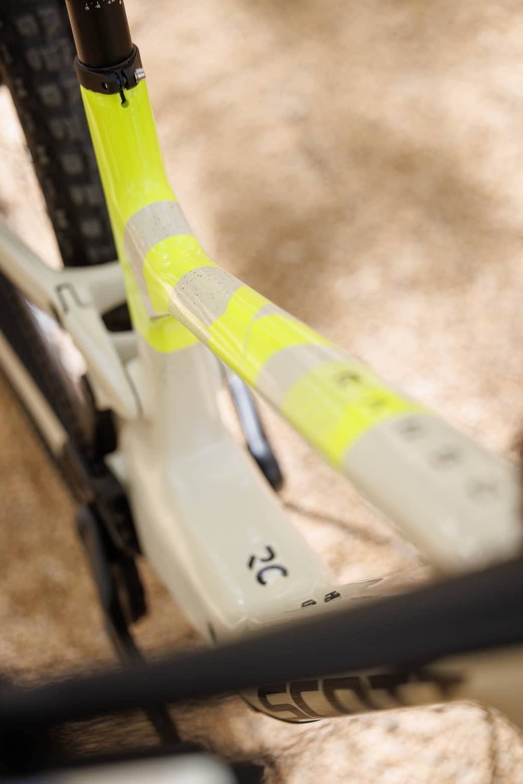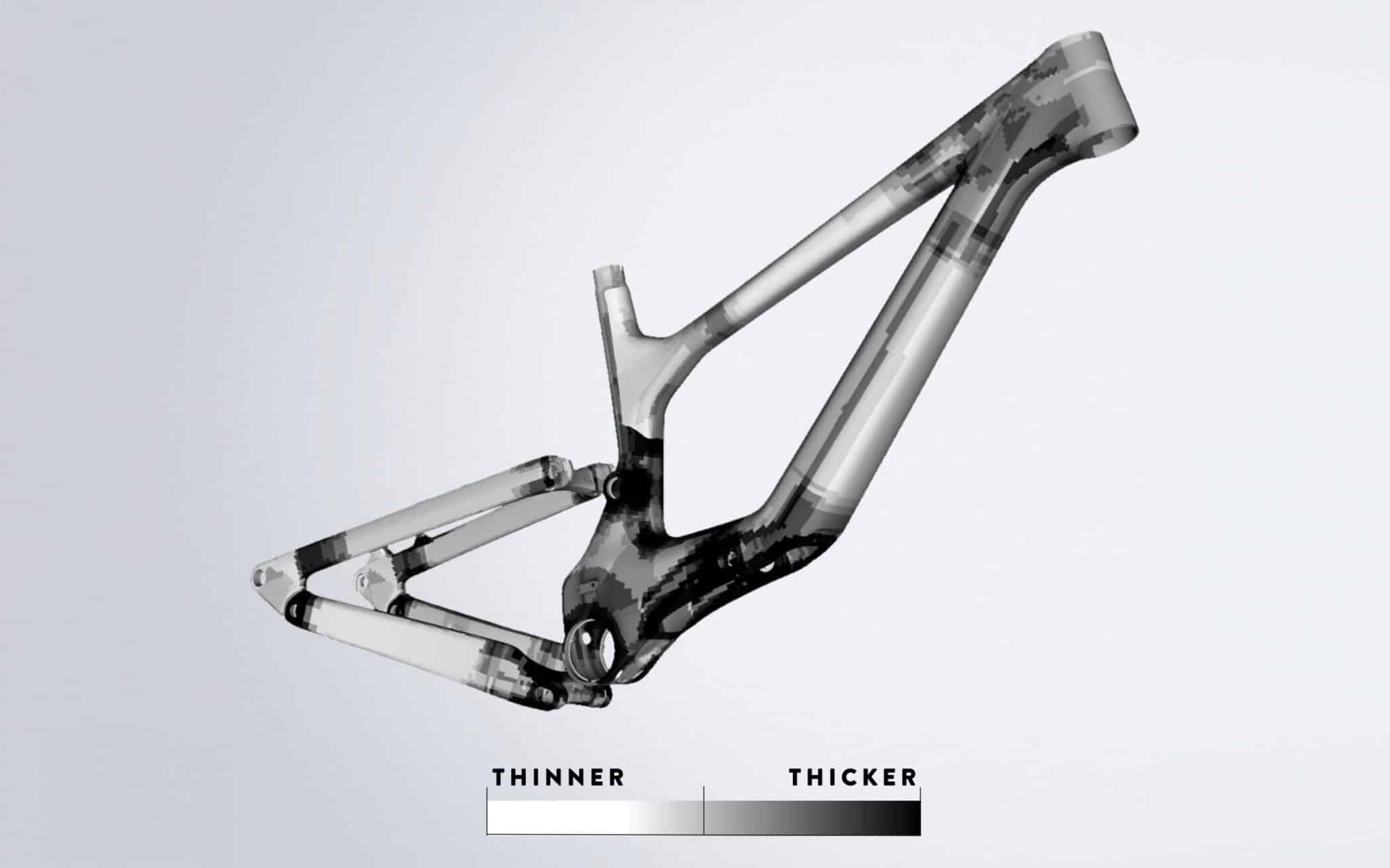 Comme d’accoutumée désormais, l’orientation, la répartition et le choix des fibres de carbone sont faites en fonction des zones de contraintes du cadre. On peut ainsi observer que la zone du boitier de pédalier/ de l’amortisseur est renforcée, alors que les zones au milieu des tubes sont plus fines. Il convient aussi de remarquer qu’au sein de la gamme, seul le luxueux modèle 900 RC bénéficie d’un cadre complètement en carbone HMX, à savoir le carbone le plus haut de gamme de la marque. Pour le reste des versions, le triangle avant est en carbone HMX tandis que les bases arrière sont en aluminium.