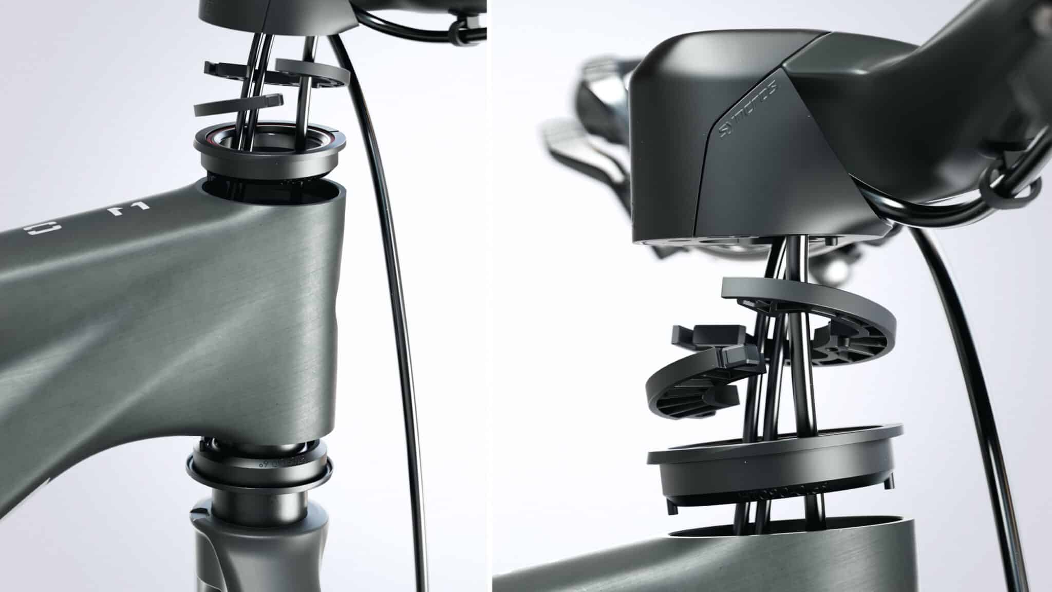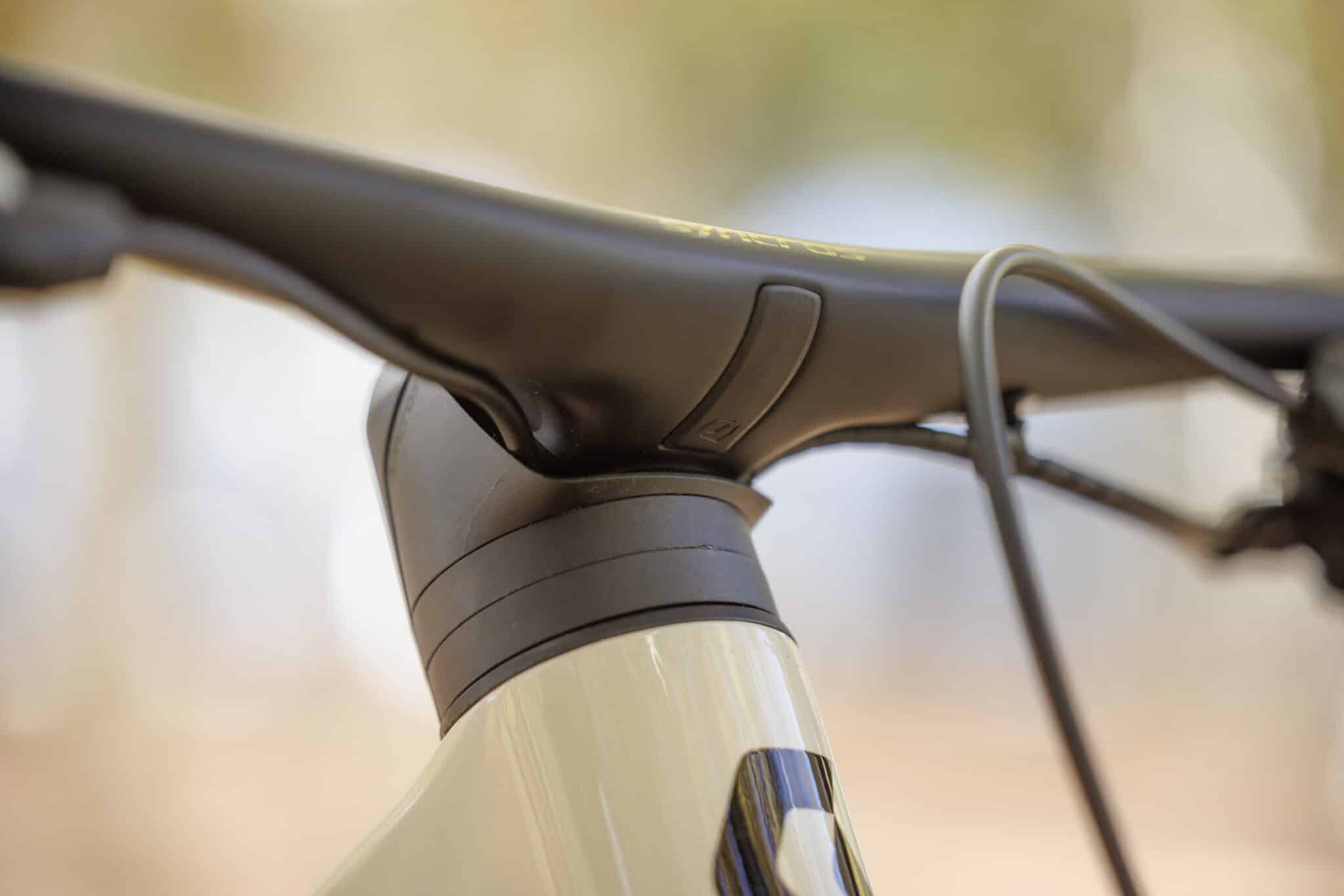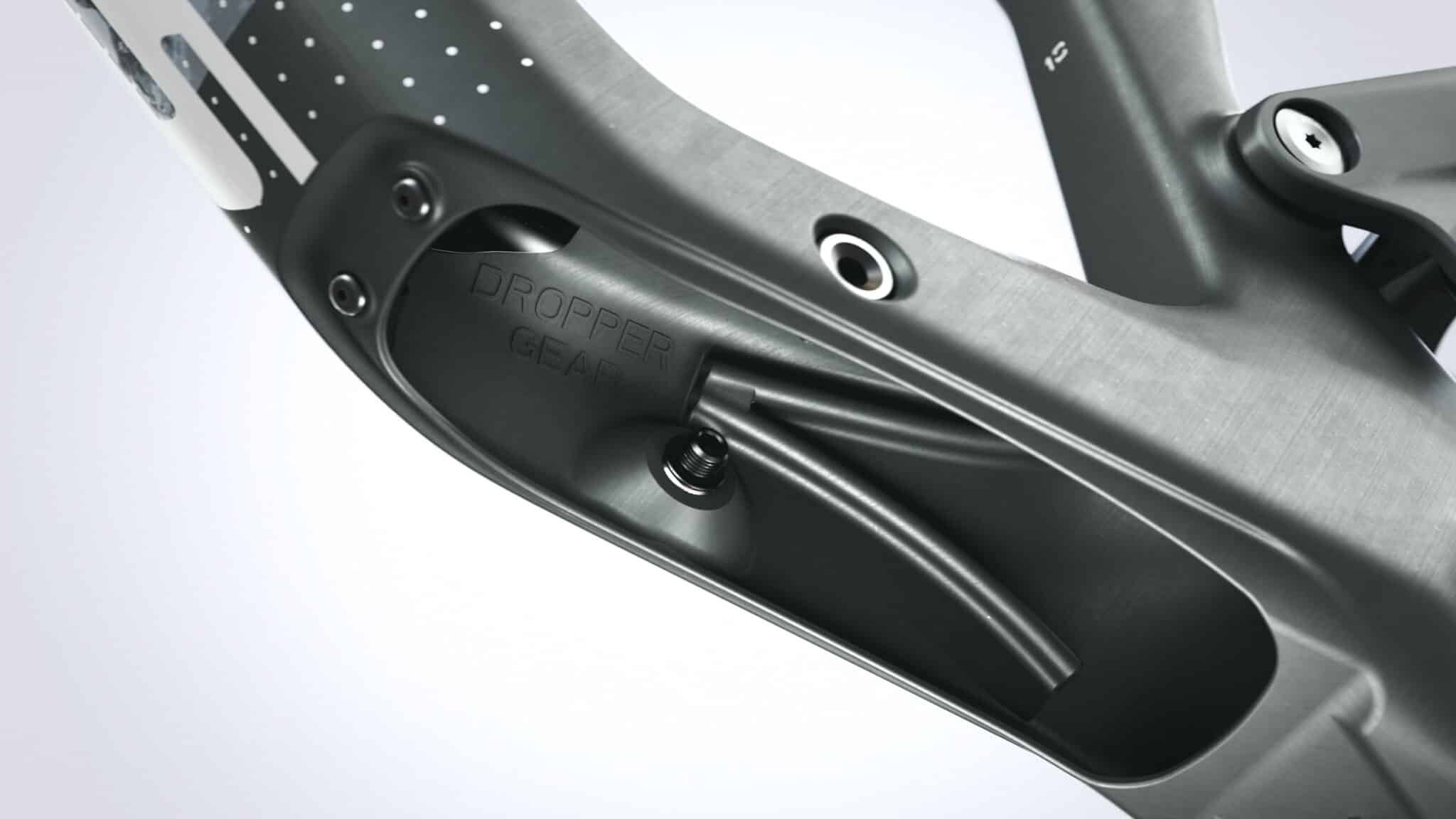Avec l’amortisseur placé à l’intérieur du cadre, Scott a également dû trouver une solution pour la tige de selle télescopique et le passage des gaines. C’est un tube moulé qui reçoit la tige de selle, doté d’une butée afin que la tête de la tige de selle télescopique ne vienne pas entrer en contact avec le point de pivot supérieur. Pour les gaines, celles-ci sont guidées a sein du triangle avant, sur le dessus de la boîte à gants avant de passer à côté de l’amortisseur et de filer vers le triangle arrière.