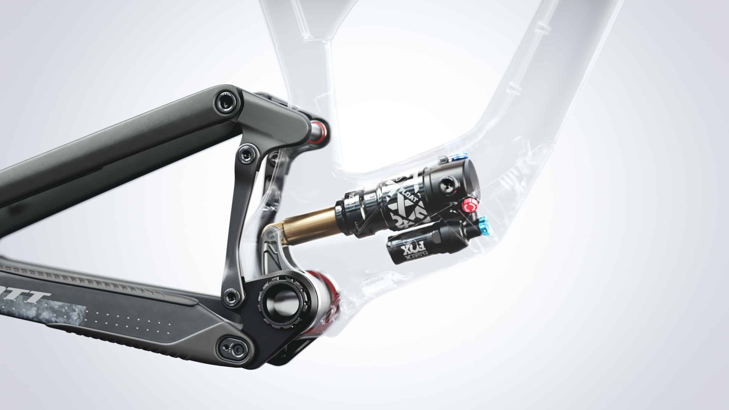 Au-delà d’être directement intégré au sein du cadre, c’est tout le positionnement de l’amortisseur qui a été revu par Scott. Celui-ci est placé de manière horizontale le plus bas possible dans le cadre, juste au-dessus du boîtier de pédalier, comme on a pu le voir sur les derniers Linkin et Unplugged de la marque sœur Bold (qui conservent une cinématique de suspension différente).