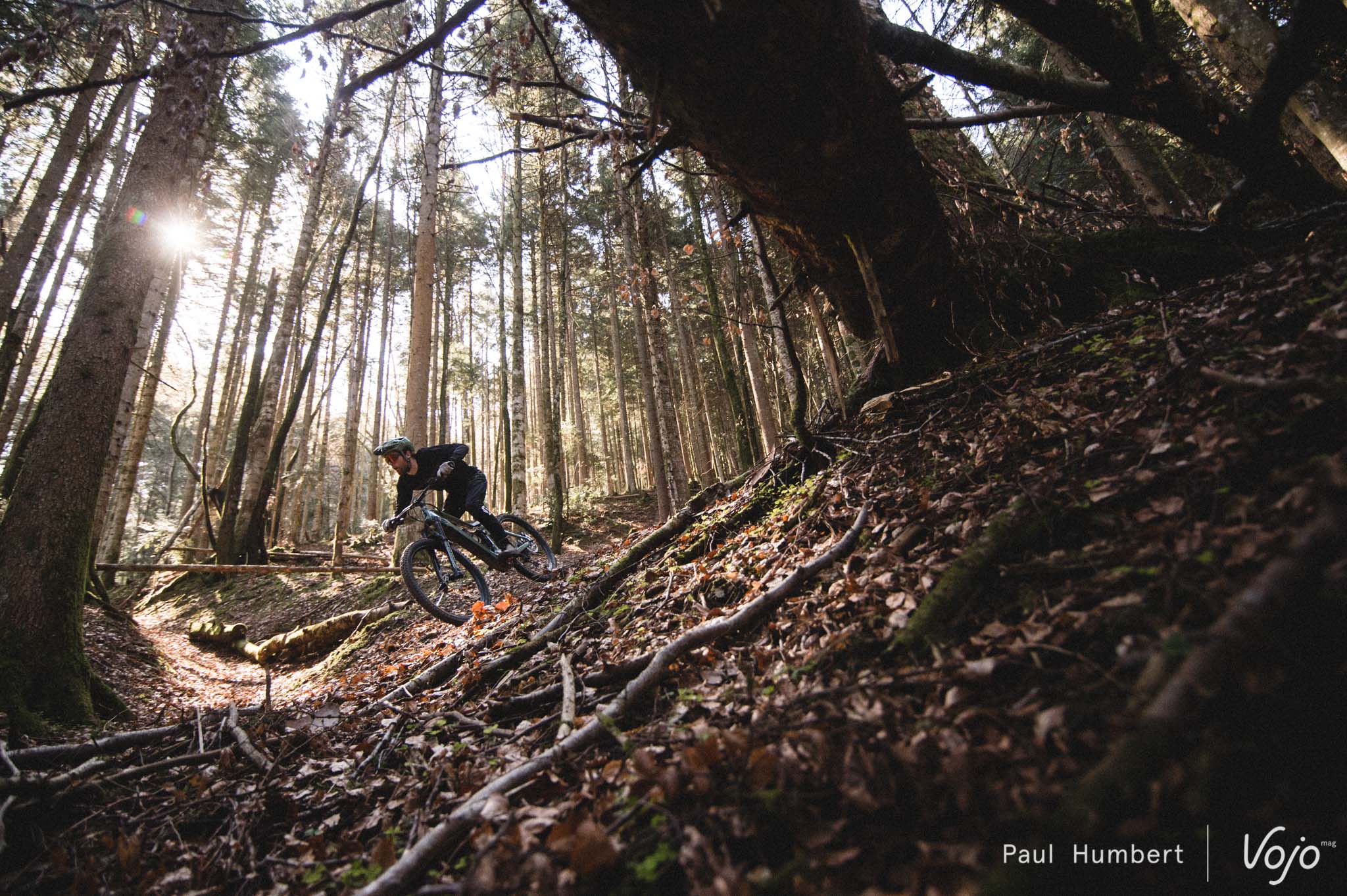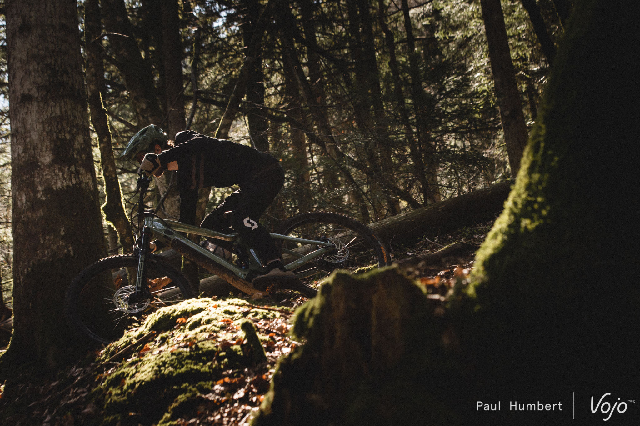 Dans les sections à plat et les petites descentes, lorsque la vitesse n’est pas très élevée, le Ransom eRide vient tout de même nous rappeler qu’il est un (très) gros vélo. L’engin est sans vie et littéralement collée au sol ; on ne fait pas du vélo, on se déplace. Ce n’est pas compliqué à rouler ou dangereux, c’est même très sécurisant mais il ne faut pas chercher à aller vite ou jouer un peu avec le terrain. La meilleure chose à faire est de piloter de façon académique, très propre, et d’attendre que ça passe.