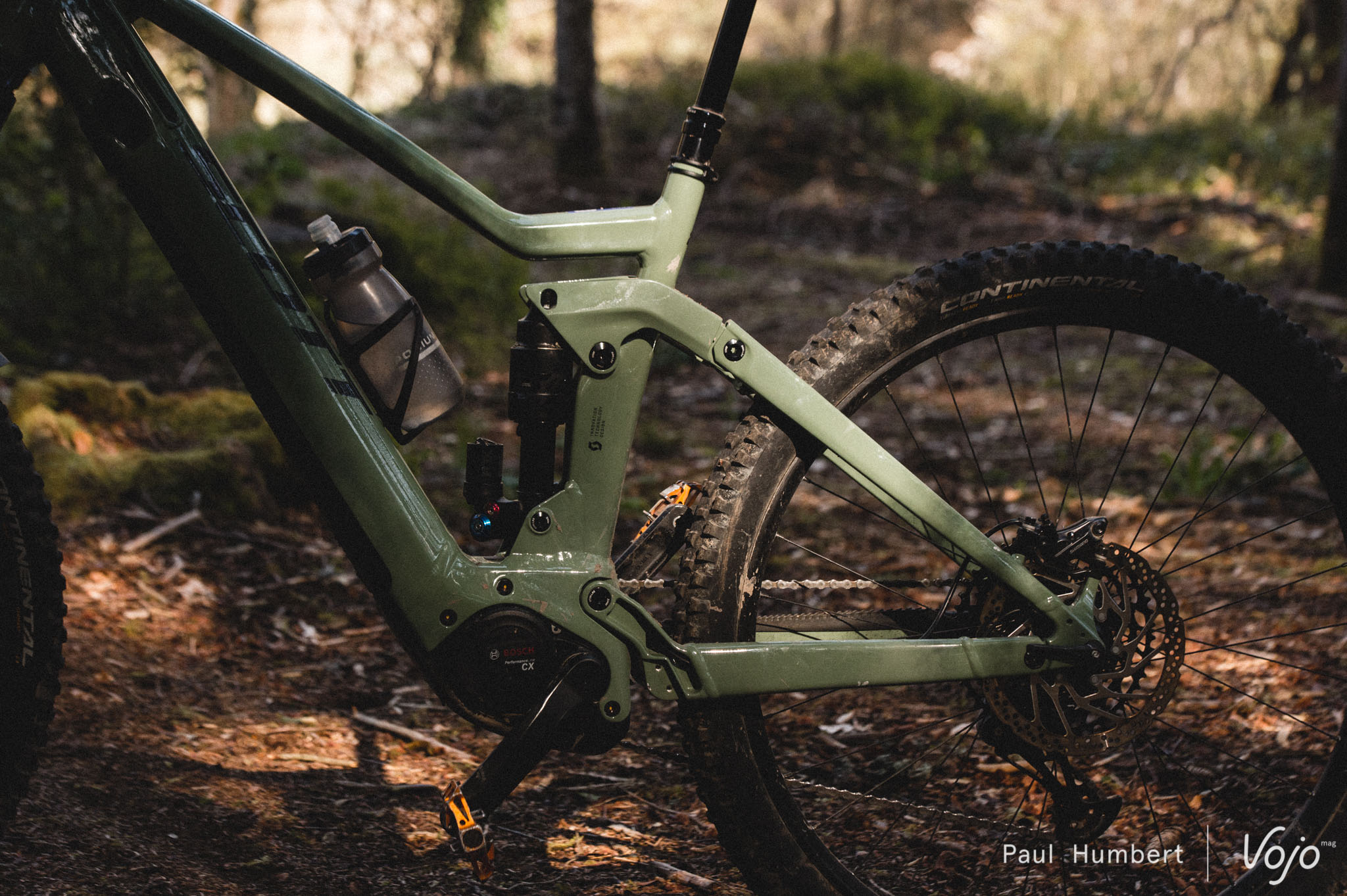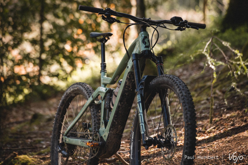 Bien que son cadre soit en aluminium et non en carbone, le vélo reprend cette identité dans les moindres détails, à tel point qu’on pourrait presque le confondre avec un Genius eRide ou un Ransom eRide s’il n’y avait l’équipement bodybuildé. Dans ce coloris vert (le seul proposé), la finition est sobre mais elle ne souffre d’aucun défaut et plusieurs éléments témoignent du soin apporté aux détails par les équipes Scott.