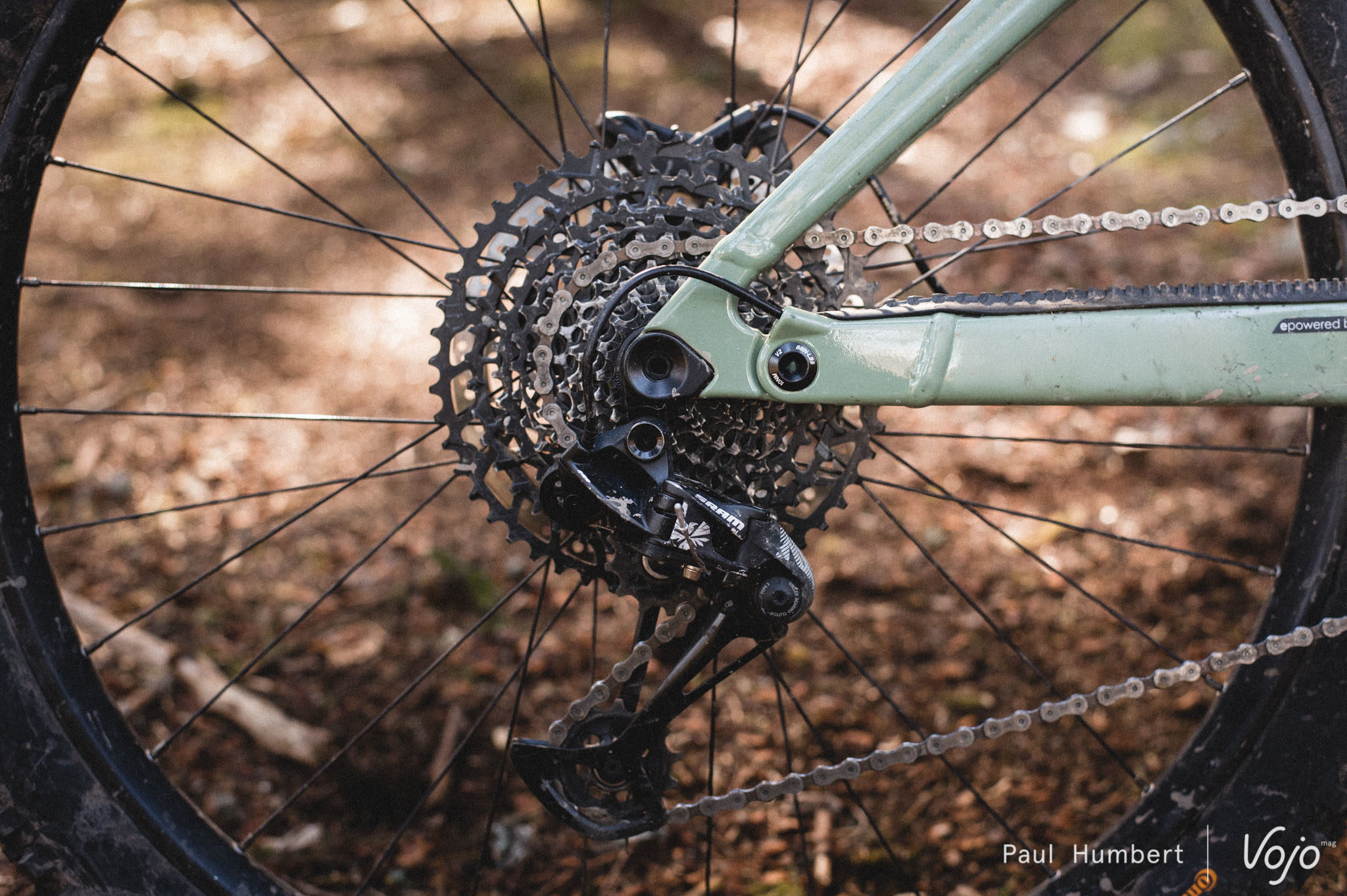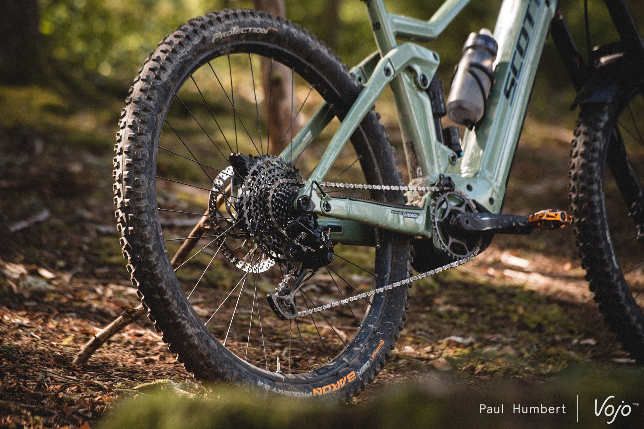 Côté transmission, Scott a fait confiance à Sram avec un mélange de NX Eagle (dérailleur) et de SX Eagle (manette, cassette, chaîne). La manette est ici en version single click, c’est-à-dire qu’on ne peut pas passer plus d’un pignon à la fois. C’est une option proposée par Sram et conçue spécifiquement pour les e-bikes, avec l’idée de préserver la durée de vie de la transmission en limitant les passages de rapports en pleine charge. A nouveau, nous n’avons rencontré aucun problème avec ces composants pendant le test malgré leur positionnement « entrée de gamme ».