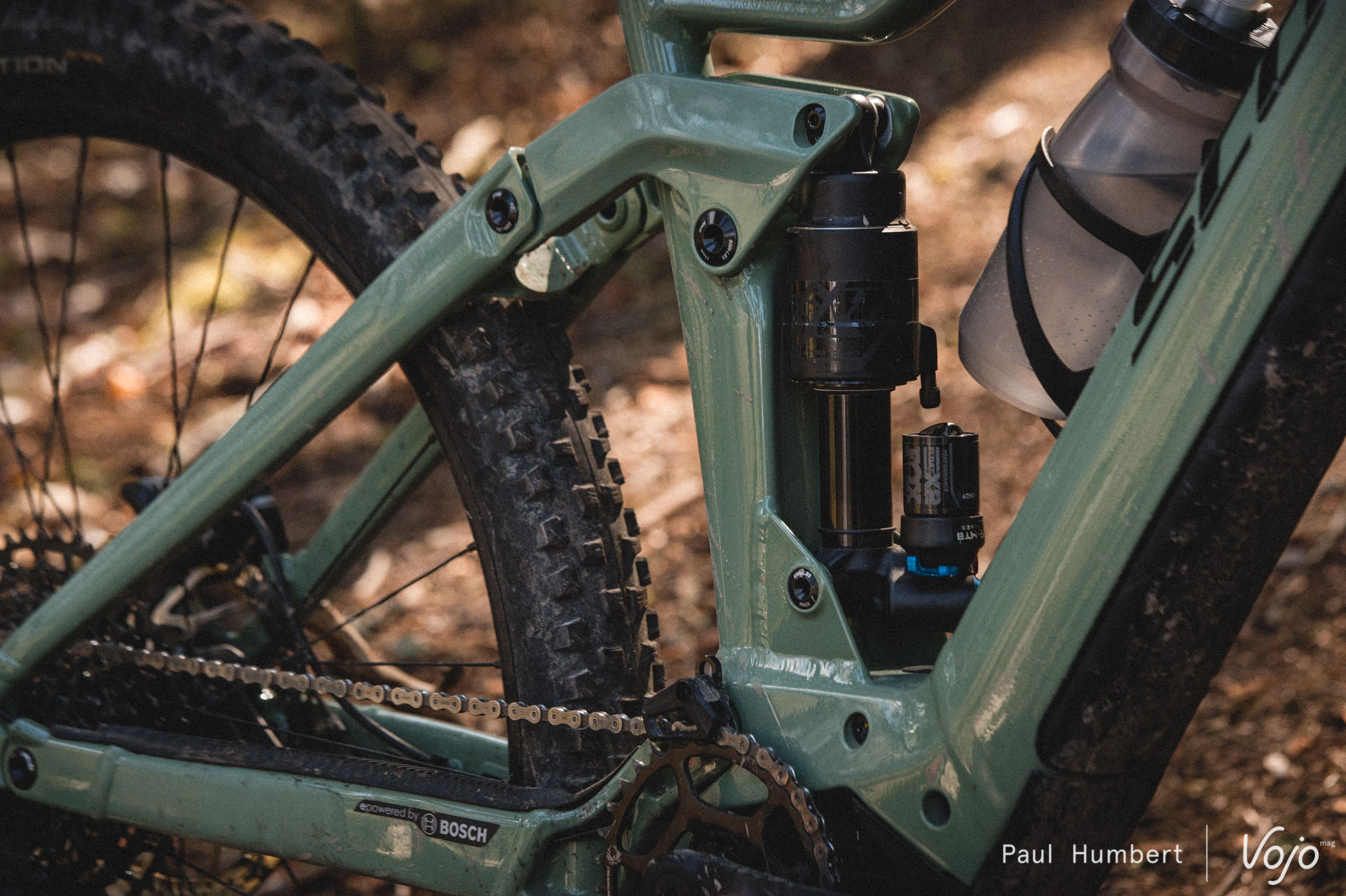 Pas de surprise non plus en ce qui concerne l’architecture de suspension, c’est du 4 bar linkage type Horst Link comme les autres tout-suspendus de Scott (à l’exception du Spark, en monopivot + biellette). La biellette est toutefois plus longue et placée plus haut que sur les Genius eRide et Strike eRide, de façon à s’accommoder du volumineux amortisseur Fox Float X2 Performance choisi par Scott pour s’occuper des 180 mm de débattement.