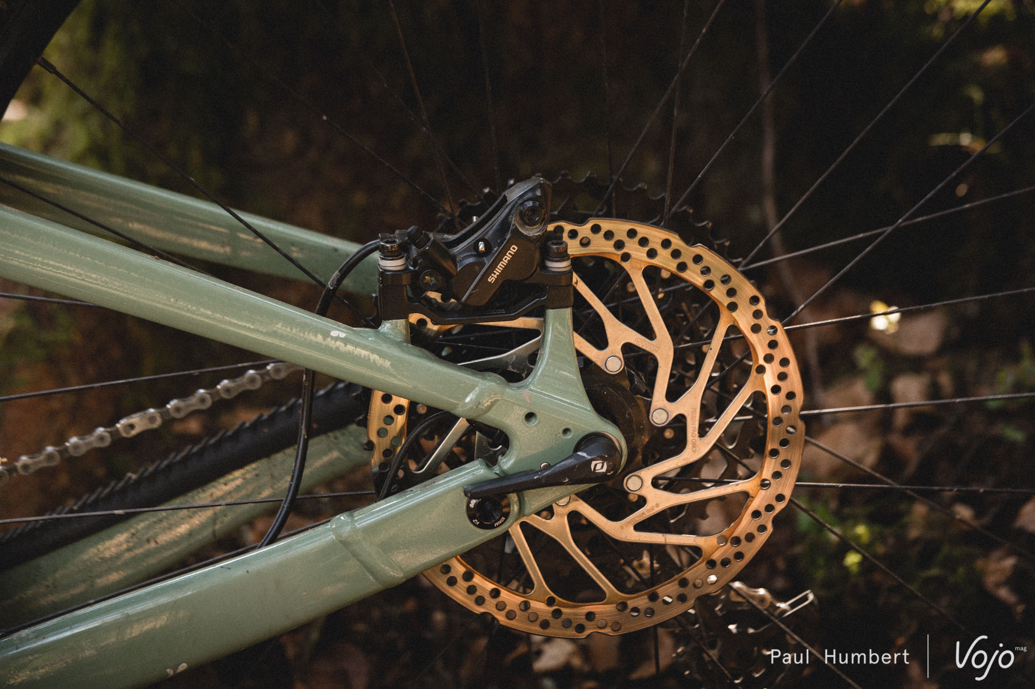 On a déjà évoqué les suspensions dans la partie qui leur est dédiée et on passe donc directement aux freins. Ce sont des Shimano MT520 en disques de 203 mm, un modèle 4 pistons « hors groupe » du fabricant japonais que l’on retrouve fréquemment sur les montages accessibles en enduro classique ou en VTTAE. Ce ne sont certes pas les plus beaux freins de la gamme, ni les plus puissants, mais leurs performances sont largement suffisantes pour arrêter un e-bike rapidement et nous n’avons jamais eu à nous plaindre de leur fiabilité, que ce soit au cours de ce test ou lorsque nous les avons rencontrés sur d’autres modèles.