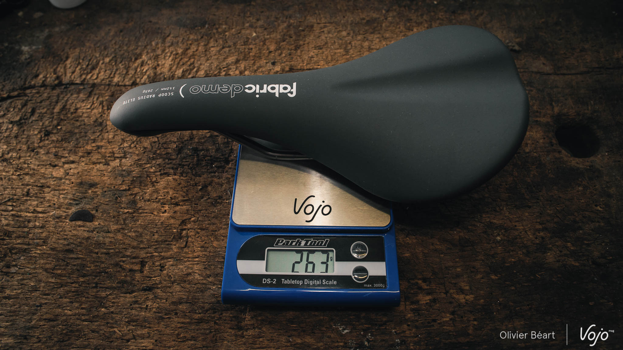 Selon le modèle et le niveau de finition choisi, les poids vont de 162g pour la Fabric Scoop Flat entièrement en carbone (coque et rails) jusque 263g pour la Fabric Scoop Radius avec rails CrMo et coque nylon qui constitue l’entrée de gamme et que nous avons testée ici. Signalons aussi l’honnêteté de la marque par rapport aux poids annoncés puisqu’il n’y a que 2g d’écart avec notre mesure (et en moins s’il vous plaît). Quant aux tarifs, ils se montrent plutôt raisonnables avec un ticket d’entrée à 64,9€. La version à rails titane (30g plus légère) est à 89,9€, mais les tarifs s’envolent dès qu’on passe aux rails carbone : 164,9€ et 274,9€ si on ajoute la coque carbone. Cela dit, on reste dans des prix proches de la concurrence.
