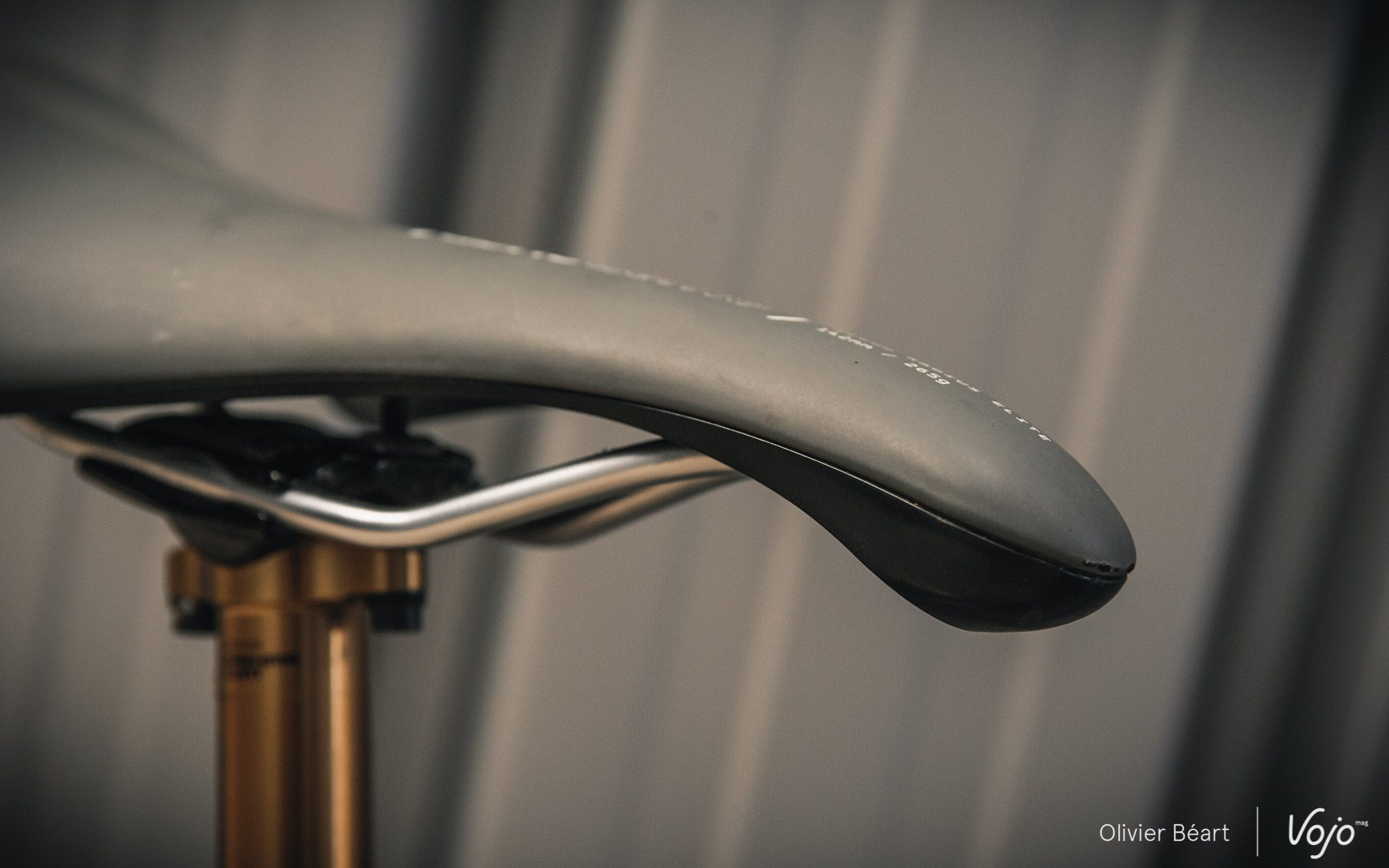 Notre selle de test disposait d’une couleur grise spéciale « demo ». Il lui est arrivé de se ternir ou de devenir brune après plusieurs sorties boueuses l’hiver et des nettoyages un peu rapides. Mais un coup de jet haute pression ou un passage avec un produit détergent suffisent à lui faire retrouver sa couleur unie d’origine. Le toucher, très doux, rappelle quelque chose entre le tissu et le silicone. Il offre un coefficient de frottement qui nous a semblé idéal avec les cuissards, de sorte qu’on n’a ni la sensation de glisser, ni celle d’être collé à la selle. Une fois encore, on frise le sans faute.