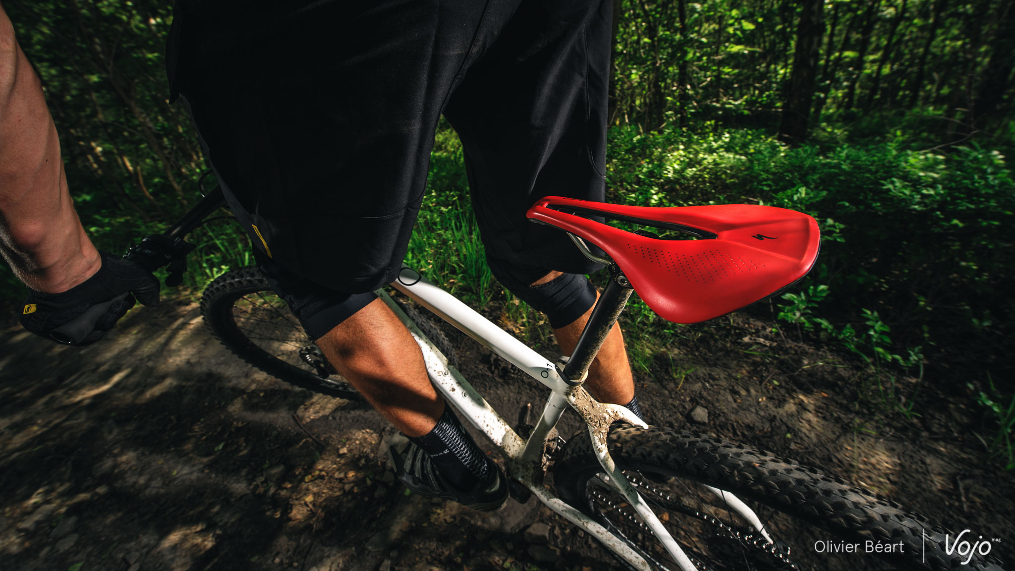 Le but de ce design particulier de la Specialized Power, combiné à une très large ouverture centrale, est d’optimiser encore plus la circulation sanguine au niveau du périnée par rapport aux selles Body Geometry classiques. Quand les modèles classiques de la marque doivent permettre de conserver au-moins 50% de la circulation sanguine en position neutre, la Power permet quant à elle de conserver le même taux de circulation sanguine même en adoptant une position plus agressive. Au départ, la Power a été pensée plutôt pour la route, mais elle est aussi tout à fait adaptée au vtt, ou du moins à certains types de pratiques comme nous le verrons un peu plus loin.