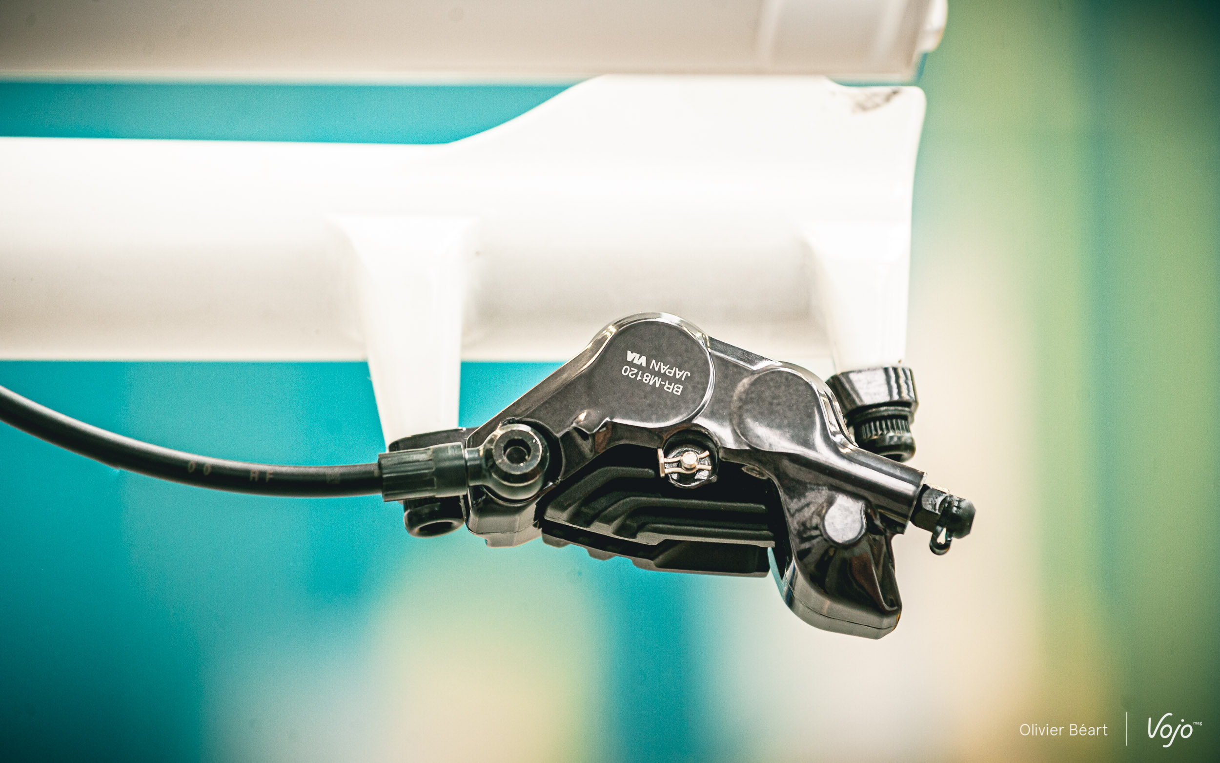 A la sortie de la boîte, la filiation avec la série M8020 est évidente. Les formes sont très proches, la finition évolue peu et le seul changement réellement visible est le collier du levier désormais décalé vers l’intérieur, ce qui permet d’avoir un deuxième point de contact avec le cintre pour plus de rigidité. Pas de changements côté réglages et ergonomie, on retrouve l’excellent levier un doigt, une molette pour le réglage de la garde et une vis peu efficace et dure à manipuler (quelle idée de mettre vis en croix) pour le point de contact.